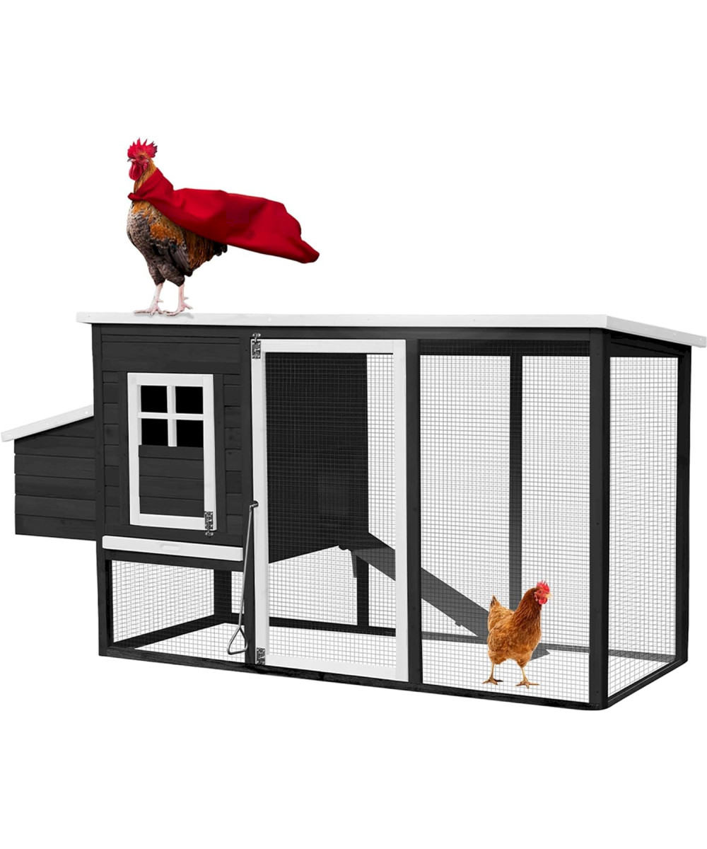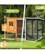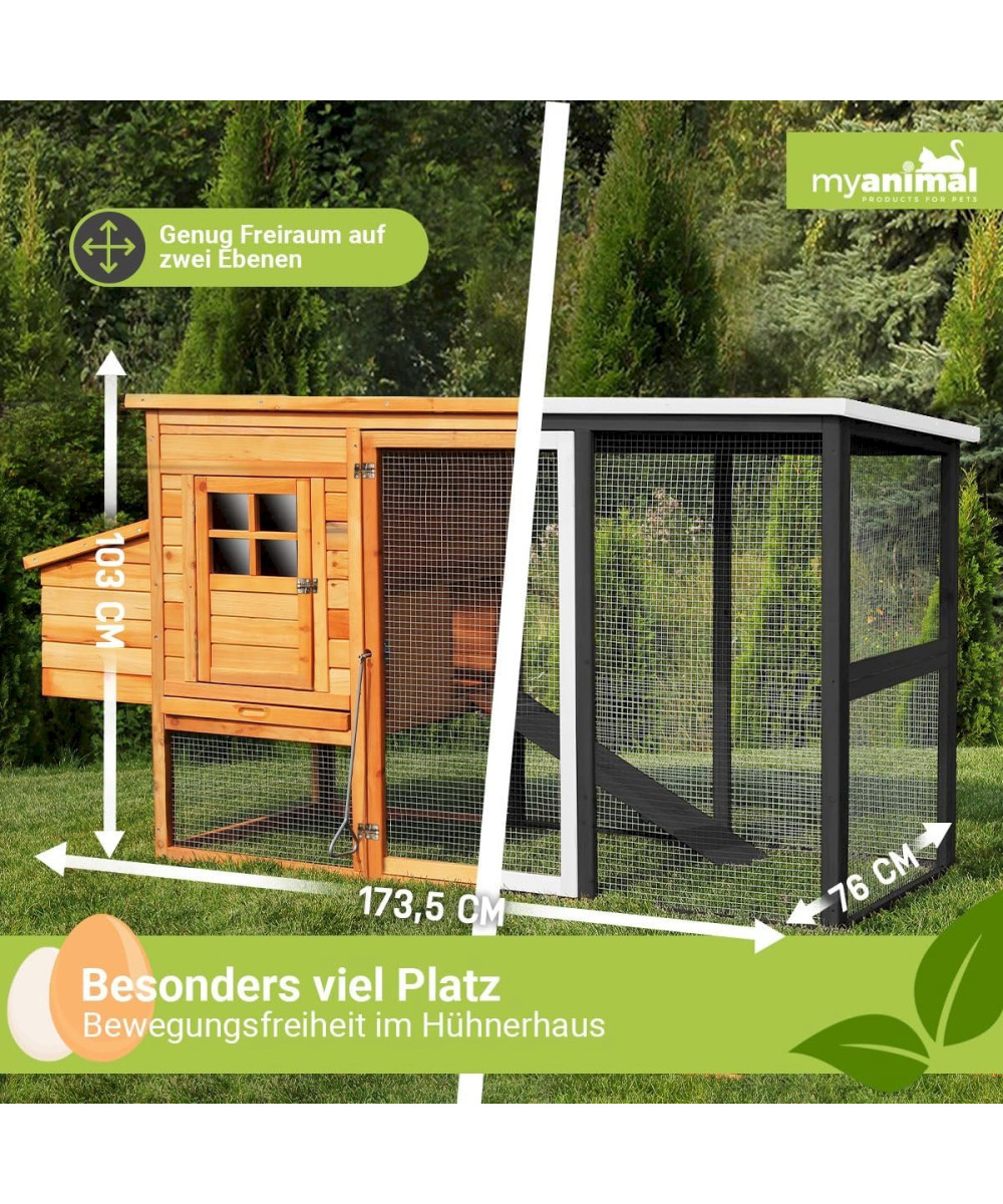 Mit einer Länge von 173,5 cm, einer Breite von 76 cm und einer Höhe von 103 cm bietet der MyAnimal Hühnerstall MH-04 mit Eiablage genügend Platz für mehrere gefiederte Bewohner. Auf zwei Ebenen finden sowohl Hühner als auch Wachteln und Zwerghühner ausreichend Freiraum.