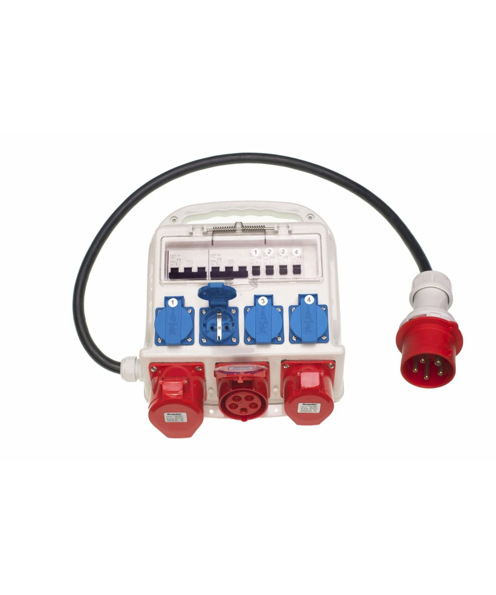 - Der Stromverteiler verfügt über 2 x CEE400V-16A; 1 x CEE400V-32A Anschlüsse sowie für 4 Stück Standart 230V Schukosteckdosen