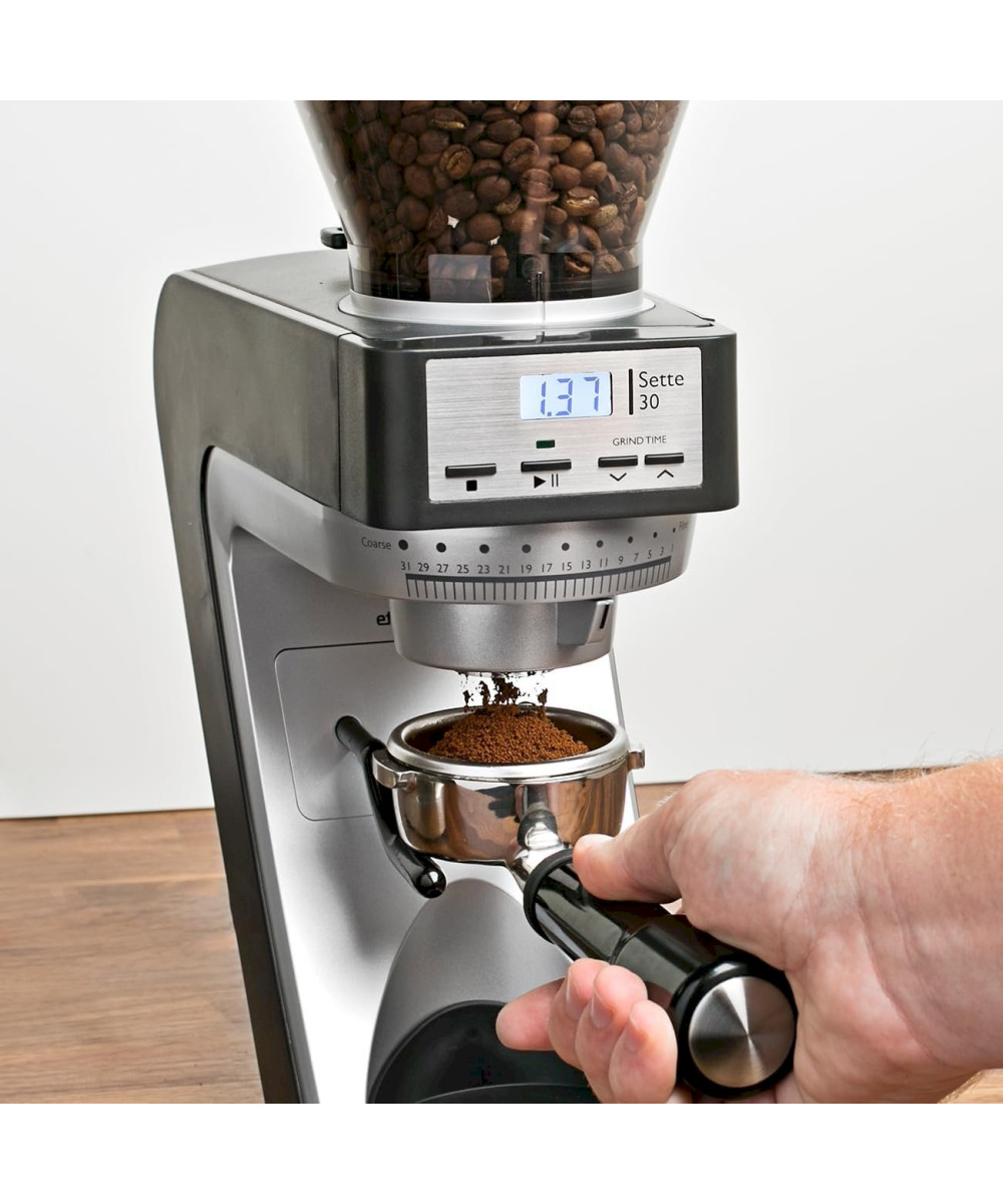 Die Baratza Sette 30 AP verfügt über 30 Mahlgradeinstellungen. Darüber hinaus kann mit den mitgelieferten Unterlegscheiben der Mahlgrad voreingestellt werden und macht somit auch ein Mahlen für Filterkaffee möglich.