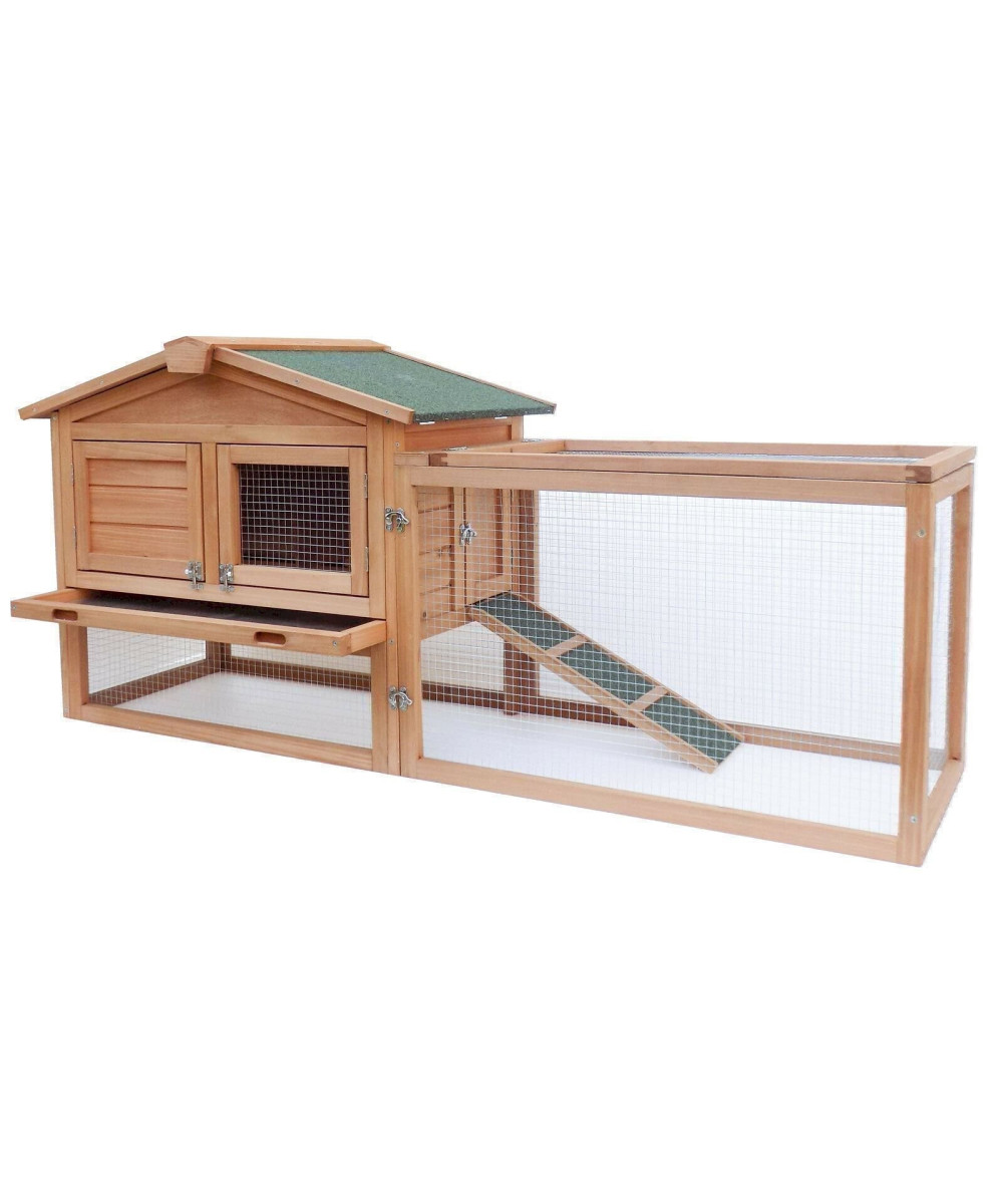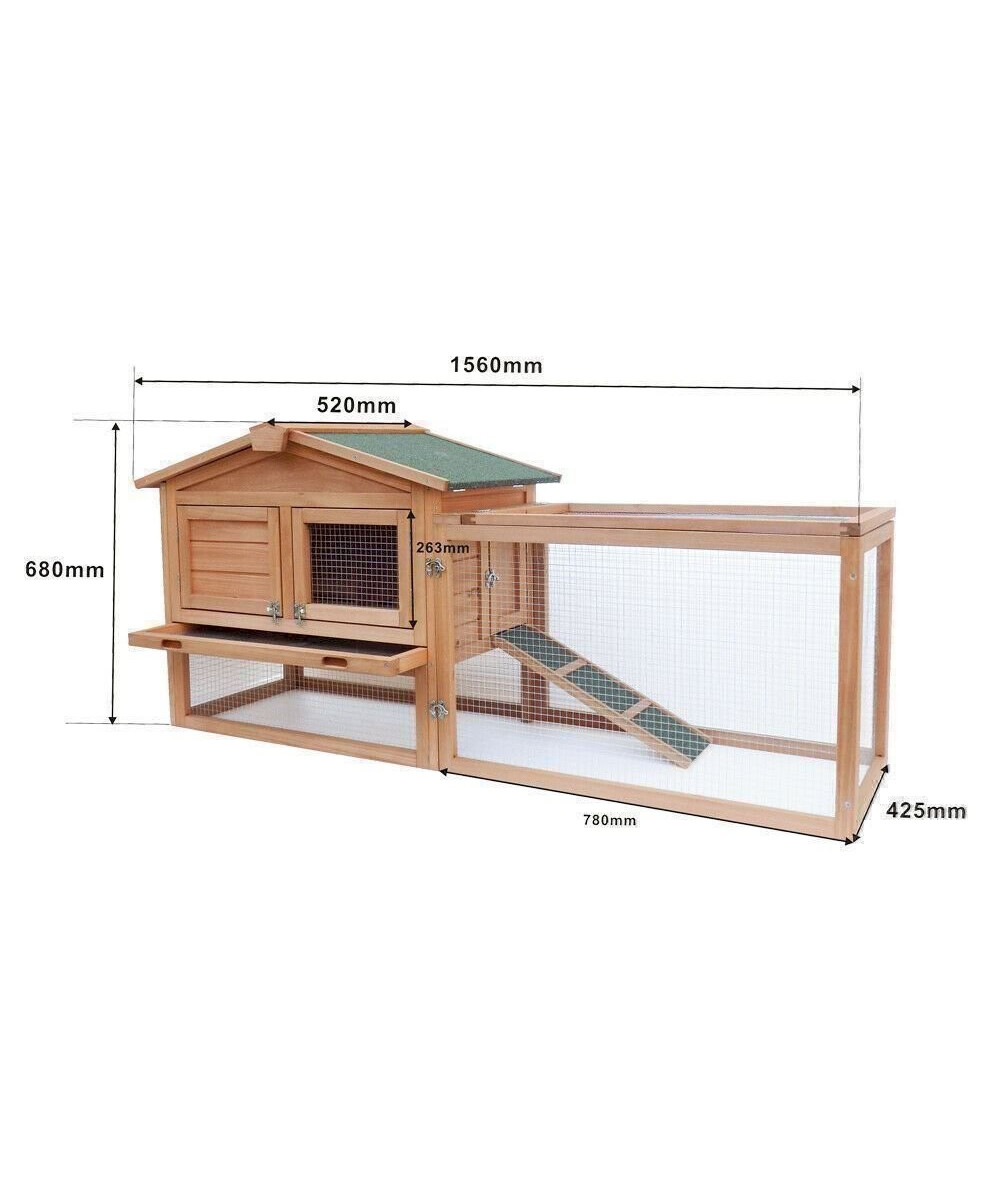Das Modell in XXL- Format hat die Maße: 156 cm x 52 cm x 68 cm . Es ist umweltfreundlich lackiert und weist besondere Funktionen auf: Neben dem großzügigen Freilauf im Gehege kann das Tier über eine rutschsicher beschichtete Schräge in den Unterschlupf gelangen, um sich sicher und warm zu fühlen. Das mit grünem Bitumen abgedichtete Dach kann zum Reinigen und Füttern geöffnet werden; der Stall und auch das Gehege bieten zusätzliche Möglichkeiten zum Öffnen an.