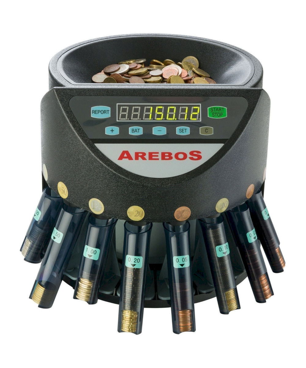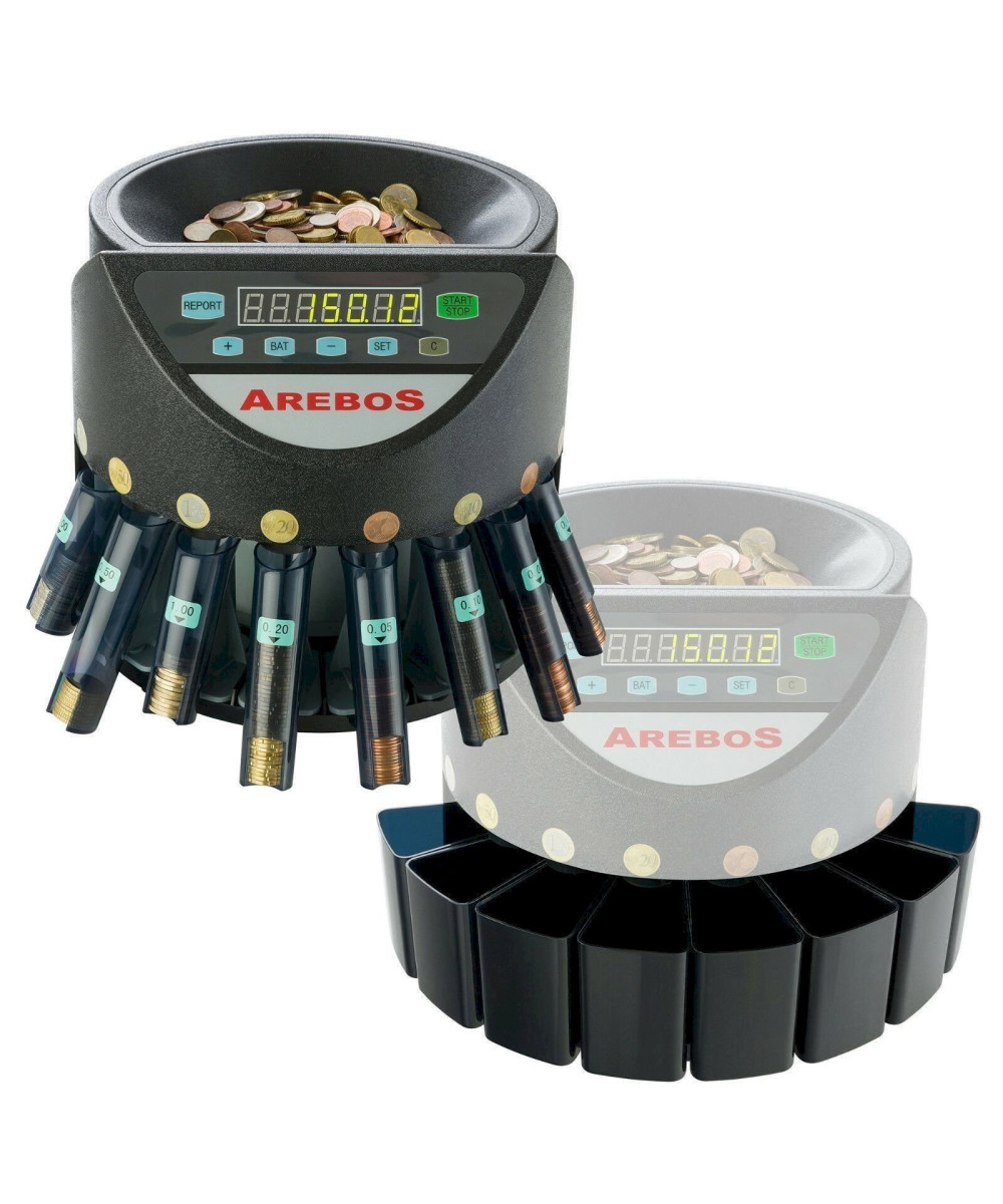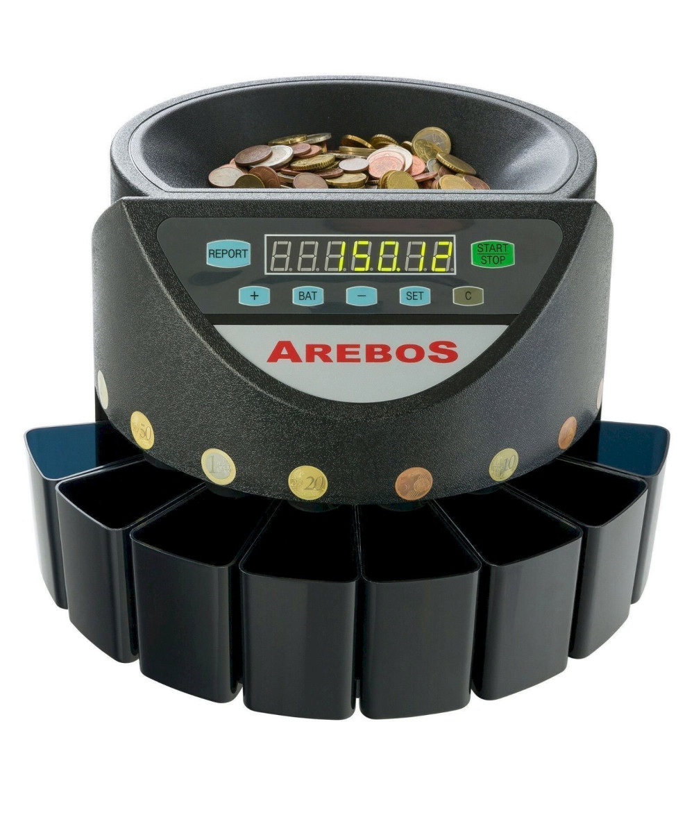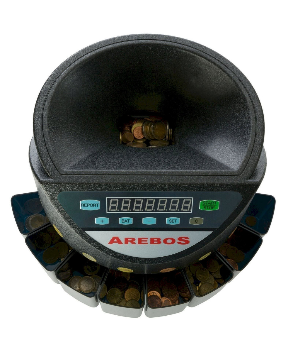 Der „Arebos Coin Sorter“ ist ein professioneller Münzzähler mit Sortier- und Zählfunktion. Der zuverlässige Zählmechanismus ist elektronisch gesteuert und verteilt die Münzen automatisch in die jeweiligen Münzboxen.