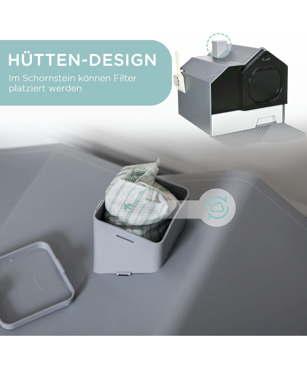 Diese Katzentoilette von HOMCOM kommt in einem niedlichen Hütten-Design und bietet ihrer Katze einen geschütztes stilles Örtchen. Sie können ein Filter in den Schornstein legen und somit die Geruchsbildung reduzieren. Zwei Filter sind Lieferumfang enthalten. Eine Schaufel zur Reinigung des Katzenklos ist im Lieferumfang enthalten. Für eine einfache Reinigung ist die Bodenwanne herausnehmbar. Die Schaufel können sie ganz einfach an der Katzentoilette befestigen.