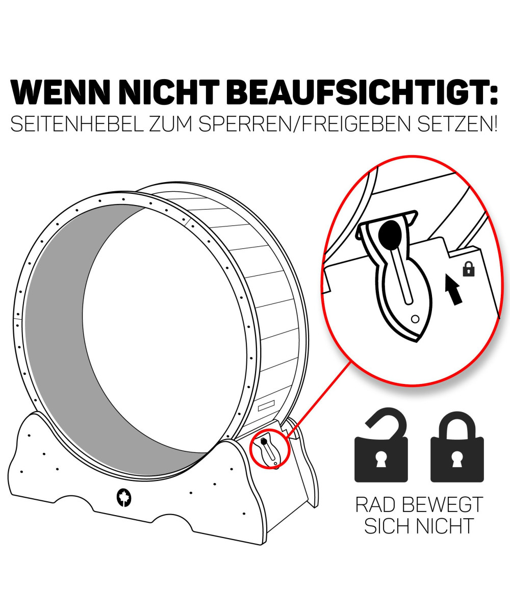 Durch die geräuscharme Konstruktion ist es möglich, dass Ihre Katze rund um die Uhr spielen und trainieren kann. Die verbauten Leichtlaufrollen sind sehr leise. Mit einem Stopp-Hebel an der Seite des Radkastens lässt sich das Rad fixieren. Somit bestimmen Sie, wann und zu welcher Zeit Ihr Stubentiger trainiert und läuft. Der Radkasten ist hierbei sicher verschlossen.