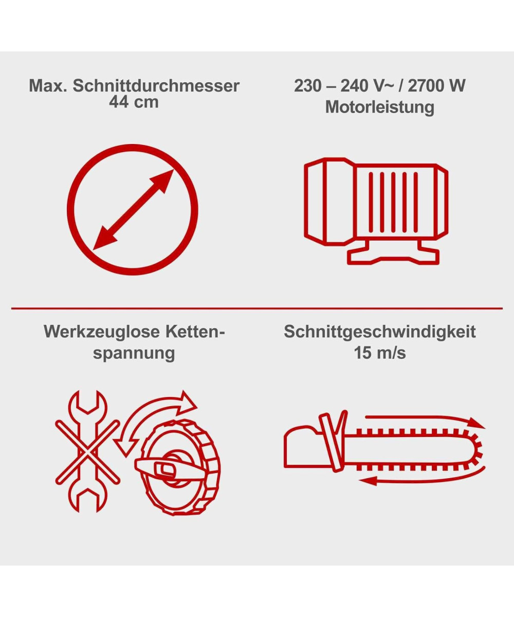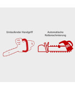 Die Kettenschmierung erfolgt automatisch, sodass man sich darüber während der Arbeit keine Gedanken machen muss. Auch lässt sich die Kette jederzeit und ohne Werkzeug über ein Stellrad und das KettenSchnellspann-System nachspannen. Dadurch erreicht die CSE2700 eine hohe Flexibilität trotz Elektroanschluss.