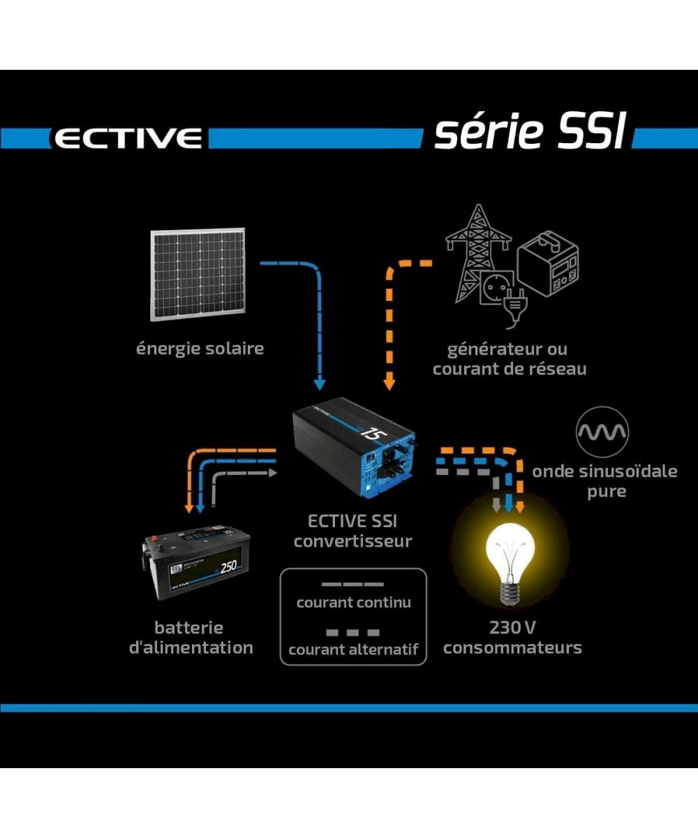 Die SSI-Serie bietet zweifellos die Flaggschiff-Modelle der ECTIVE Wechselrichter. Zusätzlich zu den Funktionen der anderen Serien, also Netzvorrangschaltung , Bypass-Funktion und integriertem Ladegerät , verfügen diese Alleskönner außerdem über einen integrierten MPPT-Solarladeregler . Sie sind somit die ultimative Lösung, wenn du auf der Suche nach wirklich autarker Energieversorgung deiner Elektrogeräte bist. Schließe deine Solaranlage einfach direkt an deinen SSI-Wechselrichter an, der die so gewonnene Energie an die Verbraucher weitergibt und die angeschlossene Versorgungsbatterie automatisch auflädt. Der Max Power Point Tracker (MPPT) sorgt dafür, dass das volle Leistungspotenzial der Solarmodule ausgenutzt und die Batterie immer schnellstmöglich nachgeladen wird. Mit dem umweltfreundlichen ECO-Modus kannst du einstellen, dass Geräte auch bei vorhandenem Land- oder Generatorstrom ausschließlich auf Solarenergie zurückgreifen. Sollte kein Solarstrom mehr verfügbar sein, schaltet der SSI-Wechselrichter automatisch auf Netzvorrang um.