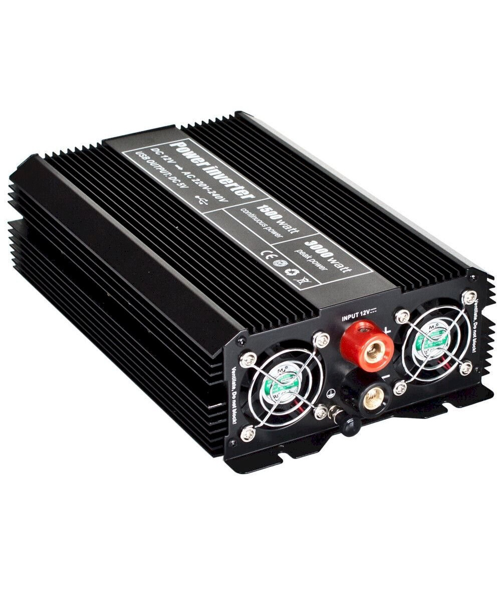Der tectake Spannungswandler, auch als Wechselrichter oder Inverter bekannt, wandelt 12 V Gleichspannung in 230 V Wechselspannung um. Es können mit ihm übliche 230 V - Geräte (Notebook, Kleinfernseher, Radio, Haushaltsgeräte usw.) bis 1500 Watt Leistungsaufnahme über ein 12 V - Bordnetz ( Auto, KFZ, Boot, Wohnmobil usw. ) betrieben werden. Das Gerät hat einen extra USB Anschluss für das Laden von Handys, MP3 usw.