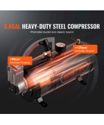 90-120 psi Luftkompressor: Der Kompressor arbeitet in einem Bereich von 90-120 psi und verfügt über ein empfindliches Manometer zur Drucküberwachung in Echtzeit. Er bläst automatisch unter 90 psi auf und stoppt bei über 120 psi, um Überdruck zu vermeiden. Der Tank hält den optimalen Luftdruck aufrecht und ist mit Sicherungen zum Schutz des Kompressors und einem Ablassstopfen zum einfachen Ablassen des Wassers ausgestattet.