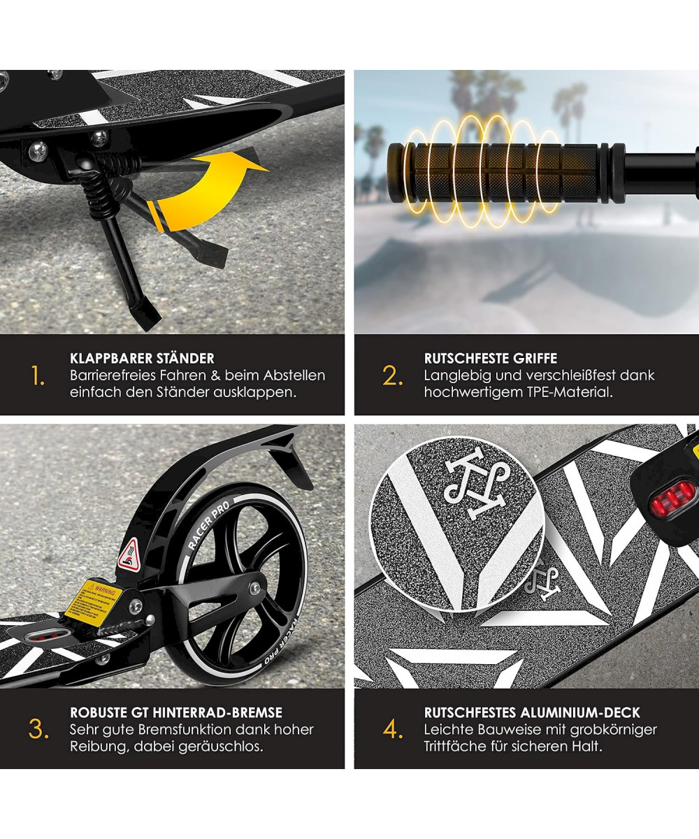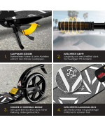 Der leichte Aluminium - Rahmen sowie die robusten und strapazierfähigen 205 mm großen PU - Reifen in Kombination mit dem starken Dualen-Federungssystem bescheren Ihnen einen leichten , schnellen und hochwertigen Trick - Roller !
