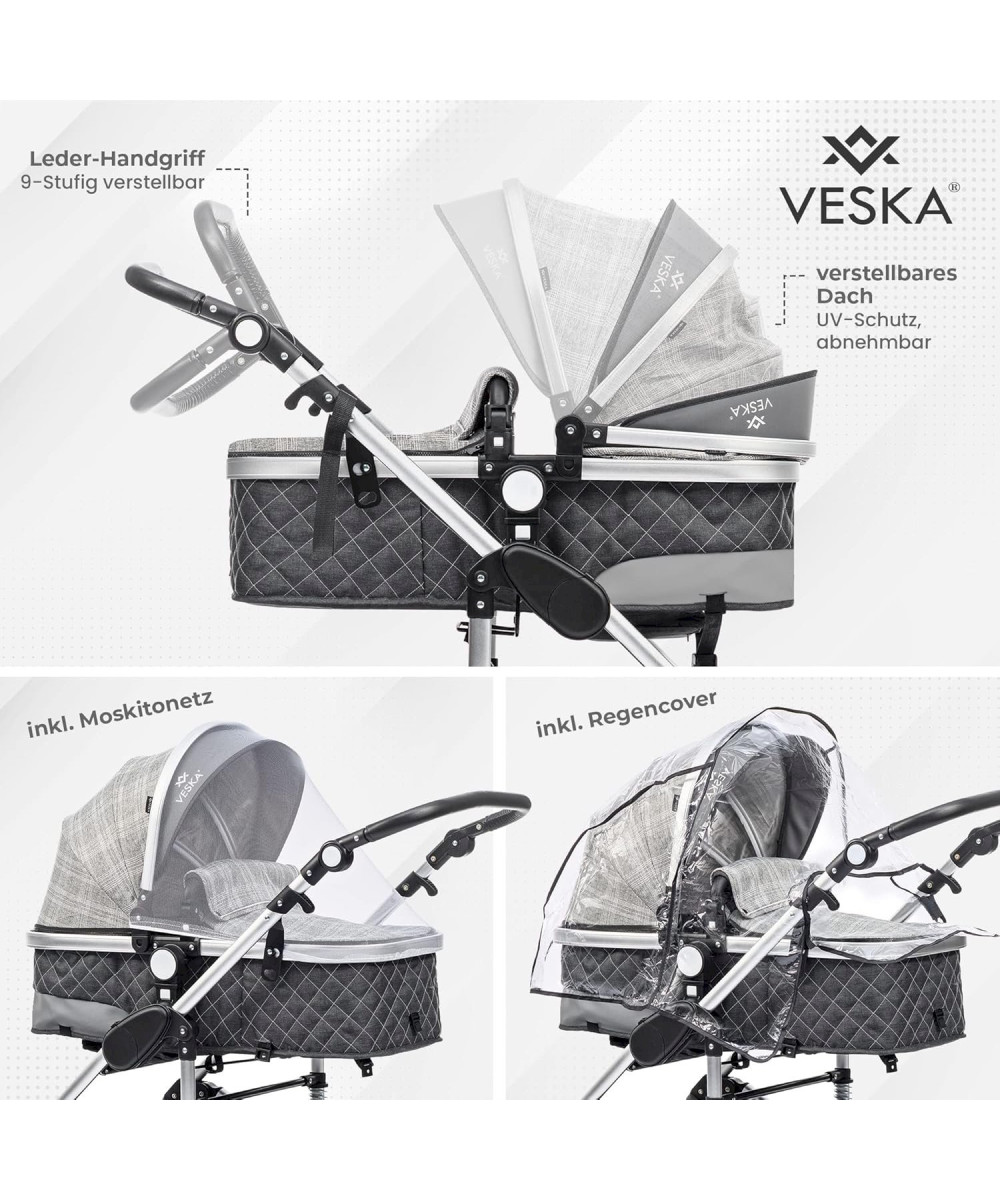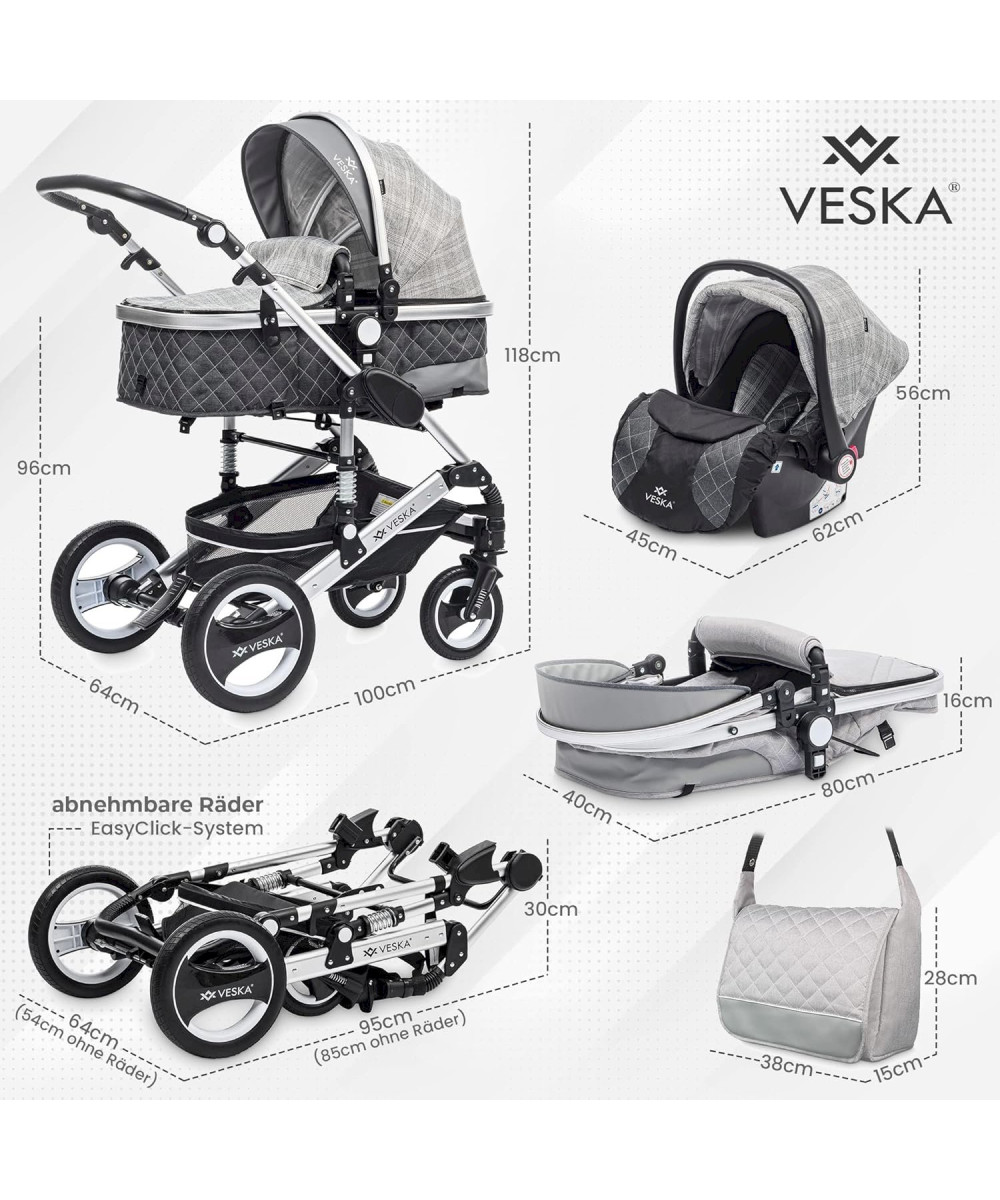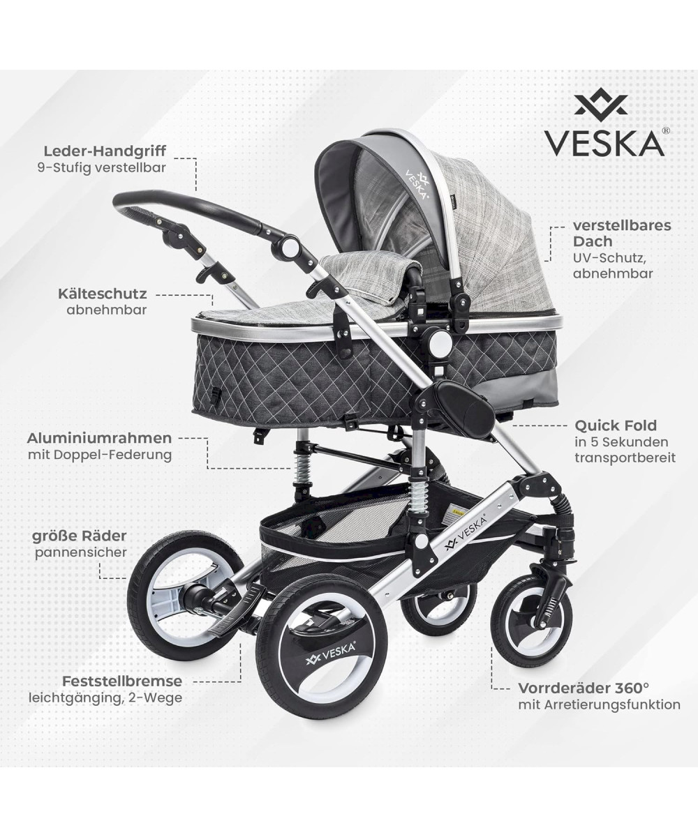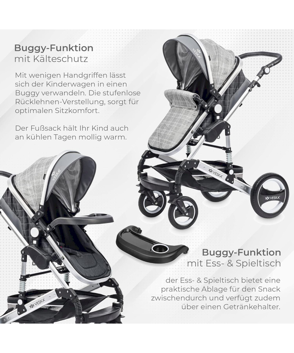 Das 3in1 Kinderwagen Deluxe-Set von VESKA® ist ein gut durchdachtes Komplett-Set für Kinder von 0-6 Jahren mit viel Zubehör! Geprüft und zugelassen nach EU-Richtlinie EN 1888-1: 2018 und EN 1888-2:2018.