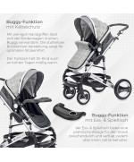 Im Lieferumfang enthalten sind zudem eine Regenhaube, ein Moskitonetz, ein Fußsack, ein Ess- & Spieltisch mit Getränkehalter, sowie ein Flaschenhalter (bis zu 1 Liter), welcher seitlich am Kinderwagen befestigt werden kann.