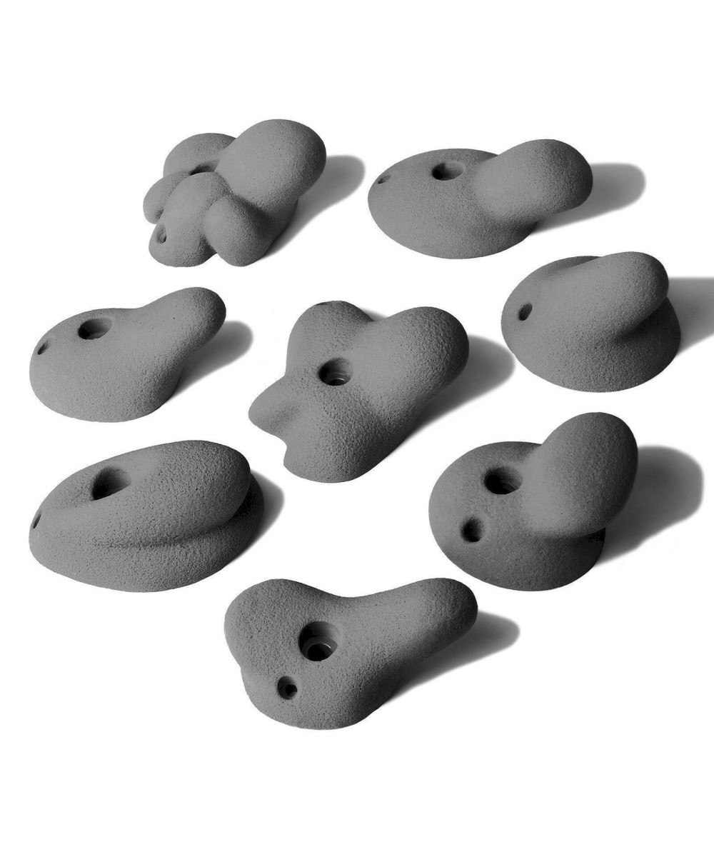 Dieses Set beinhaltet 8 schön zu greifende Henkel in verschiedenen Ausformungen und mit verschieden tiefen Hinterschneidungen. Die jeweiligen Strukturen bzw. Formen lassen ein vielfältiges Greifen zu. Damit finden auch Anfänger einen sicheren Halt, der Profi hingegen kann mit der richtigen Platzierung mit diesen Griffen die ein oder andere Route verfeinern.