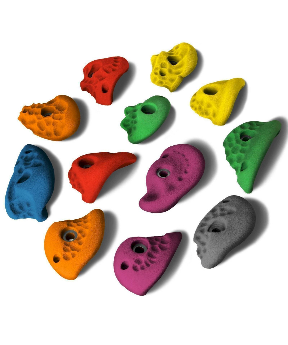Dieses Set beinhaltet 12 schön zu greifende Henkel in verschiedenen Ausformungen mit gefälligen und griffigen Oberflächenstrukturen und verschieden tiefen Hinterschneidungen. Damit finden auch Anfänger einen sicheren Halt, der Profi hingegen kann mit der richtigen Platzierung mit diesen Griffen die ein oder andere Route verfeinern.