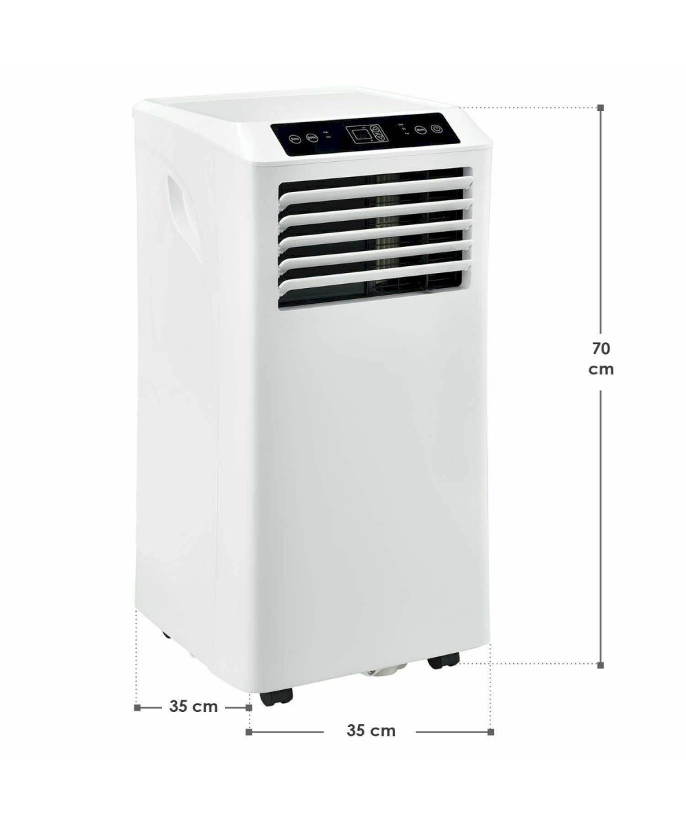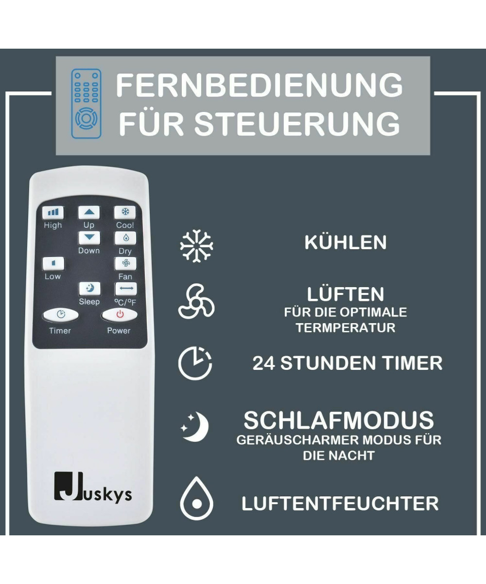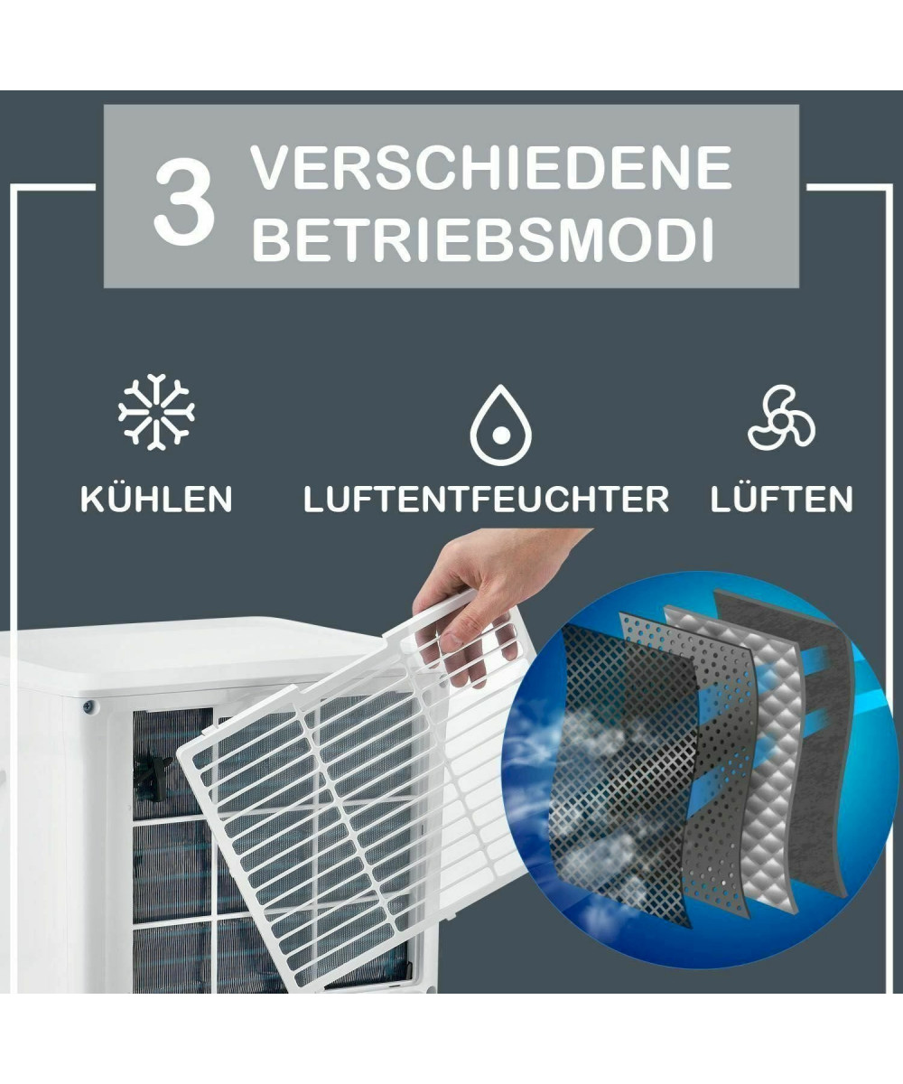 Mit dem lokalen Klimagerät MK950W2 mit Fernbedienung und Timer von Juskys sind Sie bestens für heiße Sommer gerüstet! Die Klimaanlage bringt jeden Raum in Haus oder Wohnung wieder auf angenehme Temperaturen. Der Luftkühler besticht durch eine effiziente Kühlung, einen geringen Stromverbrauch und hohem Bedienkomfort. Er lässt sich kinderleicht mit dem Bedienfeld am Gerät, der handlichen Fernbedienung und dem Timer steuern. Durch seine Entfeuchtungsfunktion entzieht das Klimagerät Feuchtigkeit aus der Luft. Über den Abluftschlauch mit Fenstereinsatz gelangt Abwärme und Feuchtigkeit bequem aus dem Haus.