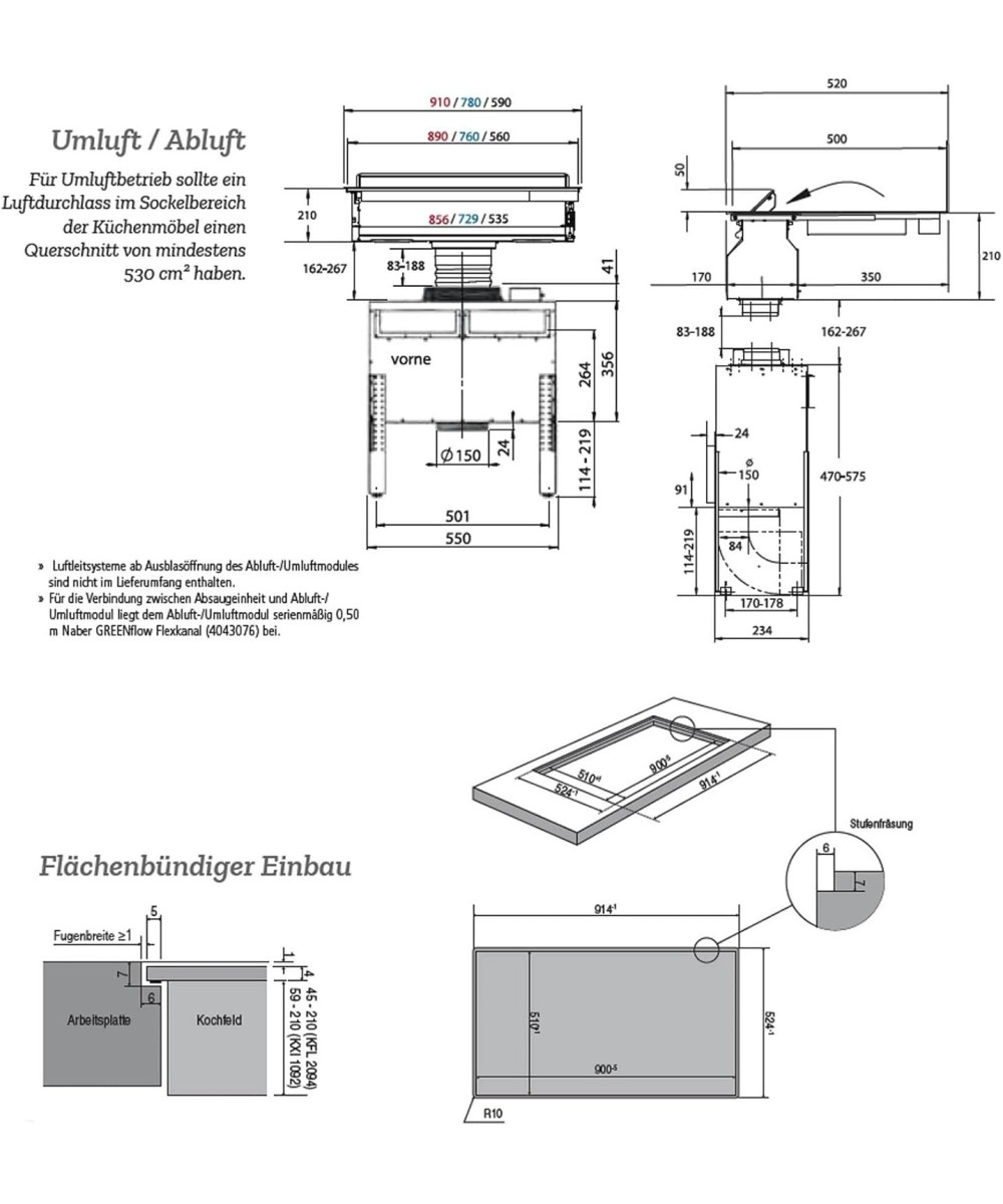 Mit dem ORANIER Kochfeldabzug KFL 2094 bringst du Innovation und Eleganz in deine Küche. Dieses Modell passt sich perfekt deinem Stil an und bietet vier flexible Einbauvarianten: flächenbündig, aufgelegt auf die Arbeitsplatte oder mit Seitenleisten oder Rahmen in Edelstahl oder pureBLACK.