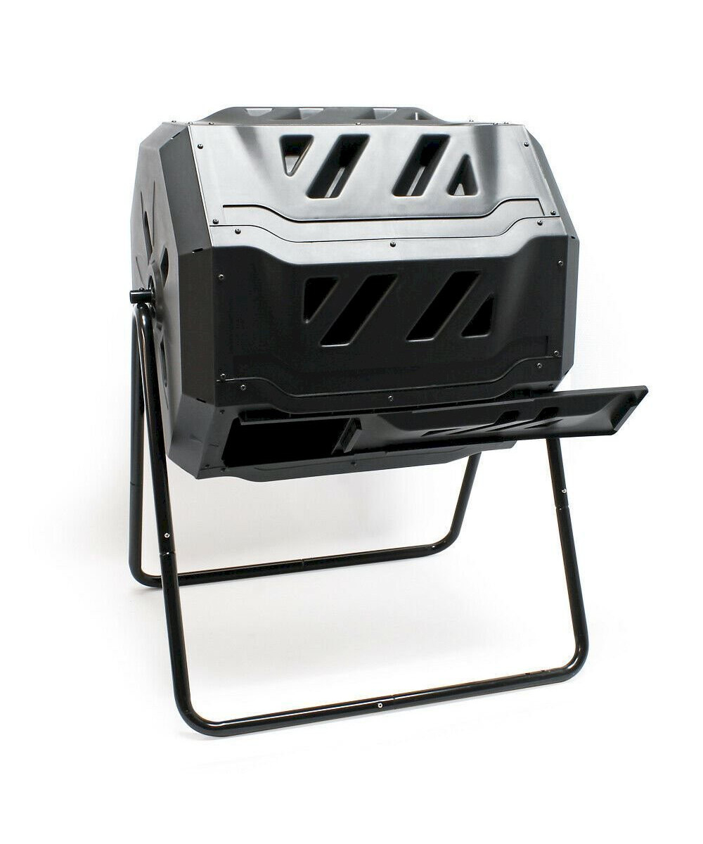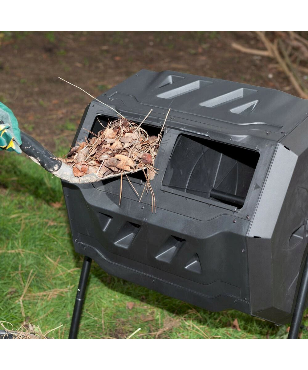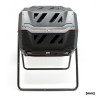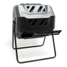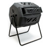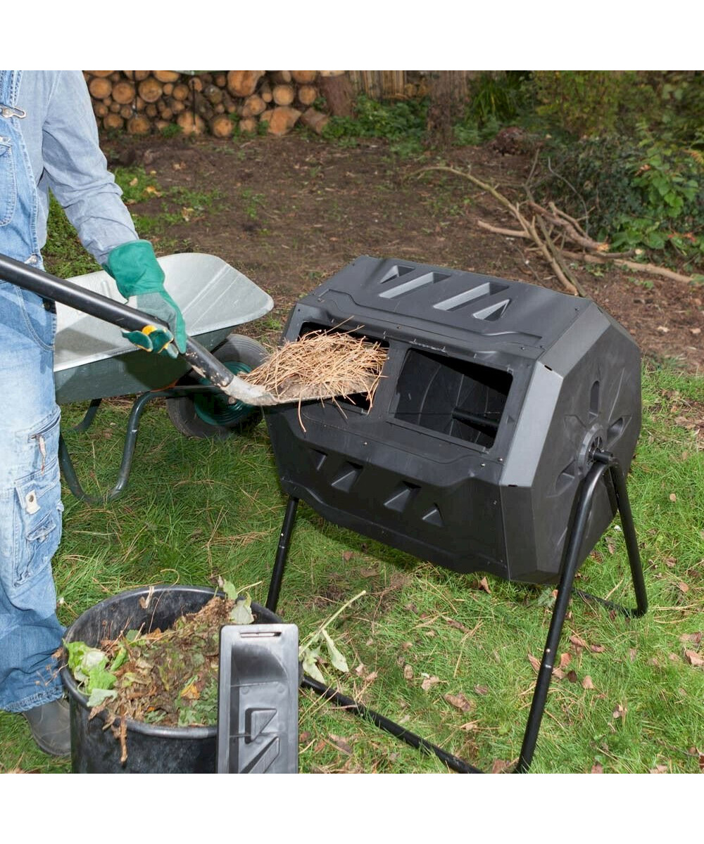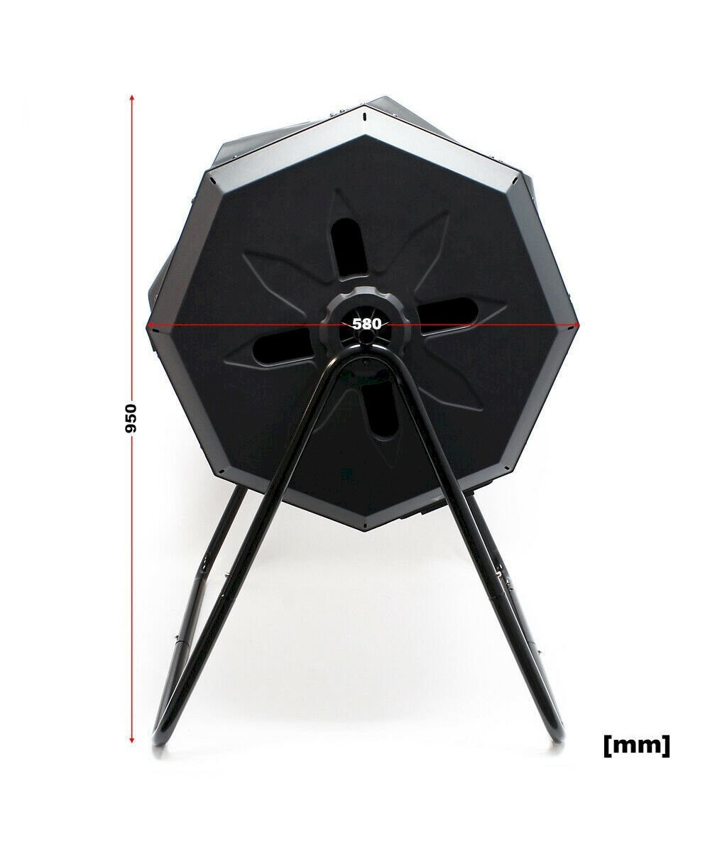 Der Kunststoffbehälter hat ein Fassungsvermögen von 160 Litern und wird von einem schwarz beschichteten Rohrgestell getragen. Damit ist die Komposttrommel frei schwebend und kann mühelos gedreht werden. Das Rotieren mischt den Kompost regelmäßig und versorgt ihn ausreichend mit Sauerstoff. Regelmäßiges Rotieren verkürzt die Rottezeit, am besten dreht man die Trommel nach jedem Befüllen 5-10 Mal oder 2-3 Mal täglich.