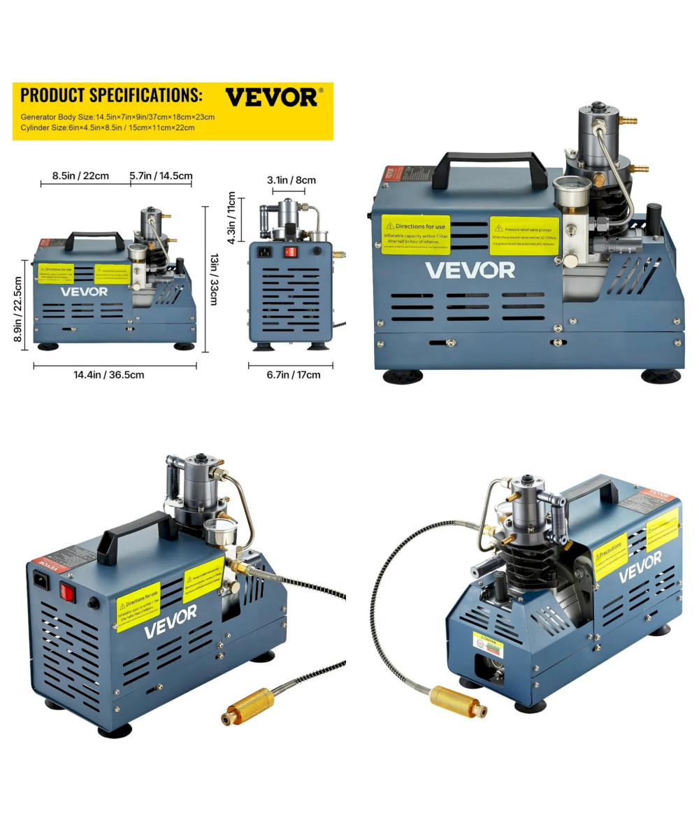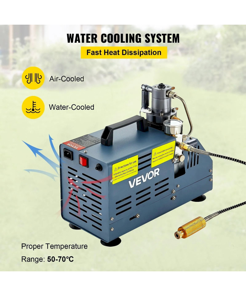 Die Pumpe ist ein 1800 W PCP-Kompressor mit zweistufiger Kompression. Mit einer automatischen Stopp-Funktion können Sie den Druck, den Sie benötigen, bevor die Maschine startet, voreinstellen. Der maximale Arbeitsdruck beträgt 4500 PSI. Der Kompressor verfügt über ein Öl- / Wasserabscheider-Filtersystem und ein Wasserkühlsystem, das eine stabile Leistung und eine lange Betriebsdauer gewährleistet. Darüber hinaus verfügt der Kompressor über eine verbesserte LED-Temperaturanzeige, ein explosionssicheres Ventil und einen Zylinder aus Edelstahl. Geeignet für Tauchflaschen, PCP-Luftgewehre, Paintballflaschen, Taucherflaschen, Luftpistolen, etc.