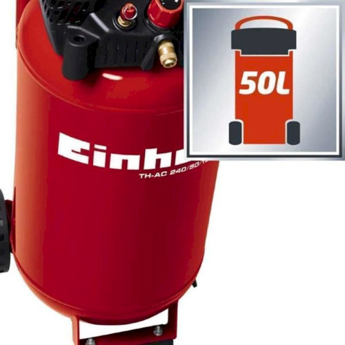 Der vielseitiger Einhell TH-AC 240/50/10 OF ist mit seinem kompakten Design in der Werkstatt oder in der Garage unverzichtbar. Der Betriebsdruck kann mittels eines Druckminderers von 0 - 10 bar eingestellt werden. Sein ölfreier Motor kommt ohne Schmierung aus und ist daher besonders wartungsarm sowie in jeder Position transportierbar. Der geregelte Arbeitsdruck des Kompressors TH-AC 240/50/10 OF wird am Druckminderer reguliert, per Manometer angezeigt und an der Schnellkupplung abgenommen. Für Mobilität und einfachen Transport sorgen der Haltebügel und die großen Räder. Das Ablassen des Kondensats aus dem Kessel per Entwässerungshahn ermöglicht eine komfortable Wartung. Zudem sorgt eine Halterung zum zwischenzeitlichen Aufbewahren des Zubehörs jederzeit für Ordnung. Der solide verarbeitete, langlebige Kessel stellt mit 50 Litern Volumen komfortable Reserven für längere Einsätze bereit.