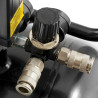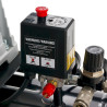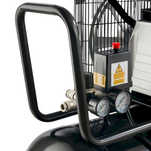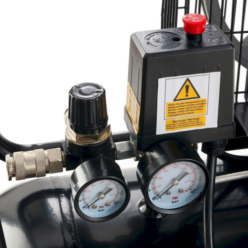 Zwei Manometer für Behälter- und Arbeitsdruck liefern einen schnellen Überblick. Eine enorme Erleichterung zwischen den Arbeitsvorgängen bietet die zweifache Euro-Schnellkupplung , die einen besonders schnellen Werkzeugwechsel begünstigt. Der Druckminderer ist für die automatische Zuschaltung bei Druckbedarf konzipiert.