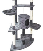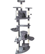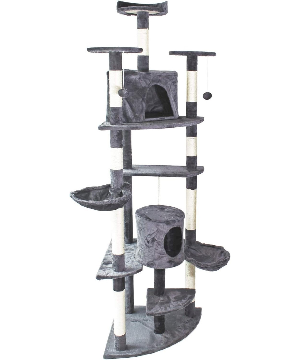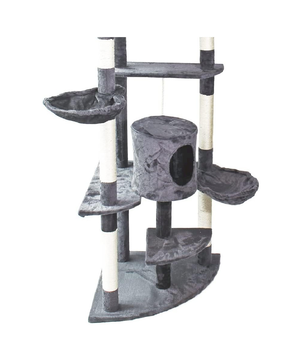 Mit diesem grauen Eck-Kratzbaum bringen Sie Abwechslung in das Leben Ihrer Katzen. Denn dieser 210 cm große Kratzbaum bietet dem Stubentiger allerhand: mehrere Plätze zum Schlafen, verschiedene Rückzugsorte zur Entspannung, unterschiedliche Spielbeschäftigungen und gleichzeitig die perfekte Möglichkeit, um die Krallen zu wetzen. Damit ist der Kratzbaum perfekt für Haushalte mit mehreren Katzen geeignet. Durch die Form passt der Kratzbaum optimal in jede Ecke.
