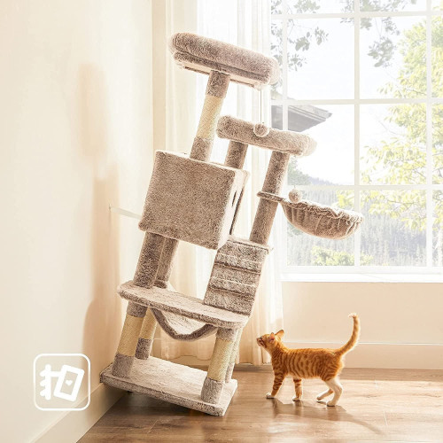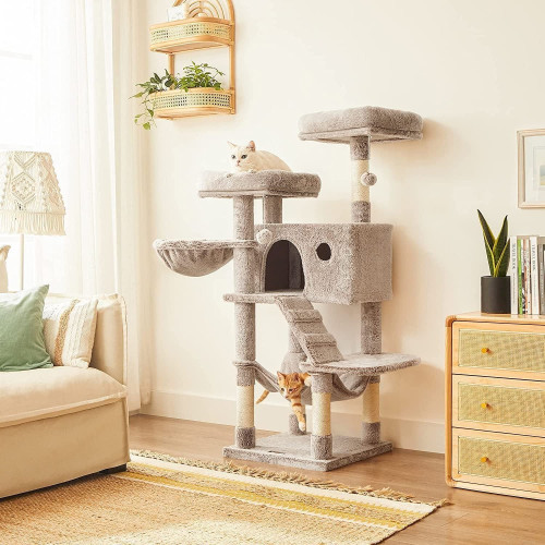 - Klettern, Krallen schärfen, entspannen: Eine Treppe zum einfachen Klettern, Sisalstämme zum Krallenwetzen, ein kuschelige Liegemulde zum Entspannen; dazu eine Hängematte für ein Nickerchen sowie 2 gut gepolsterte Plattformen mit erhöhten Rändern. Viel Spaß!