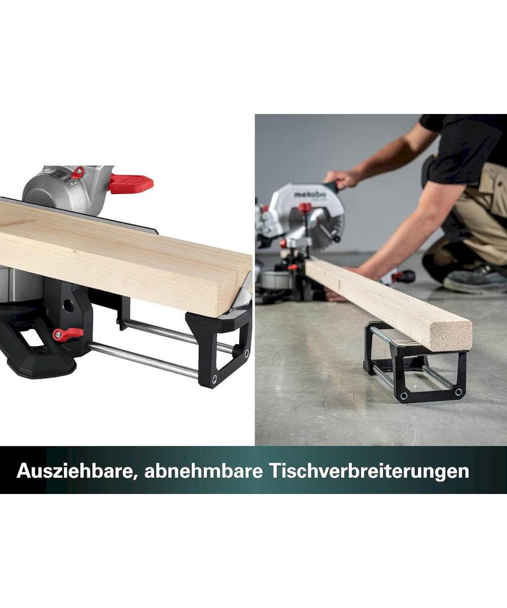 - Ausziehbare Tischverbreiterungen, auch abnehmbar zum Unterlegen extrem langer Werkstücke