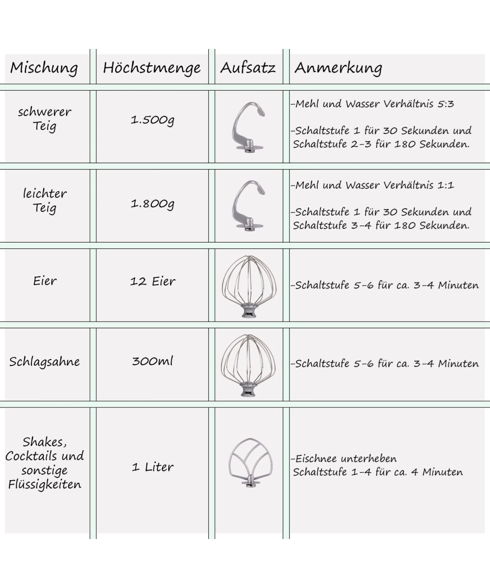 - - Leichter Hefeteig bis 1,8kg, schwerer Hefeteig bis 1,5kg, bis zu 12 Eier schlagen
