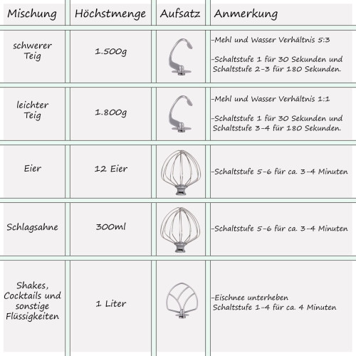 - - Leichter Hefeteig bis 1,8kg, schwerer Hefeteig bis 1,5kg, bis zu 12 Eier schlagen
