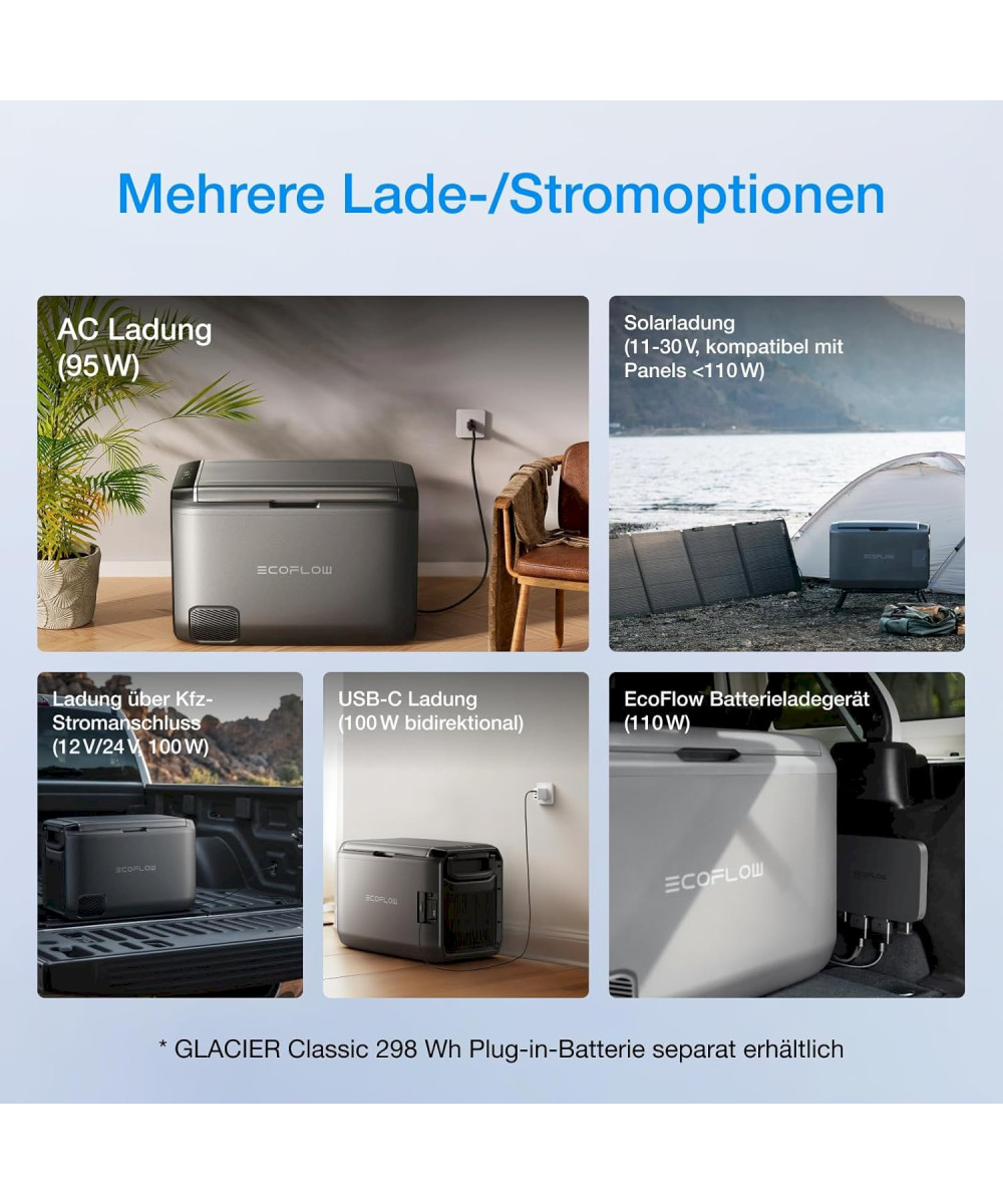 Für optimale Leistung nutzen Sie die Plug-in Batterie, um instabile Stromversorgung durch unregelmäßiges Sonnenlicht zu vermeiden. Die EcoFlow GLACIER Plug-in Batterie wird separat verkauft. - EcoFlow Batterieladegerät (110 W)