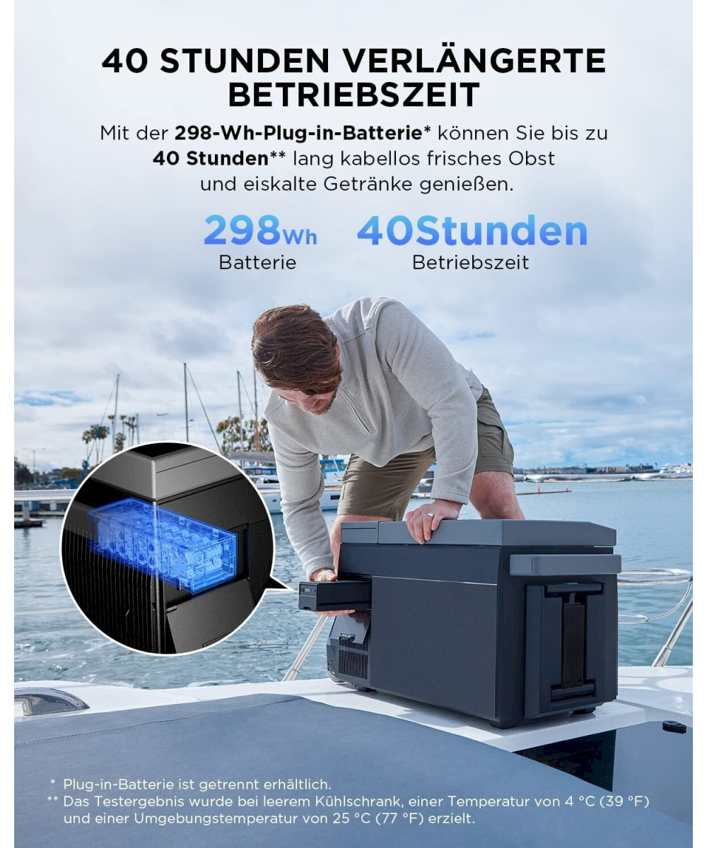 EcoFlow GLACIER wurde für absolute Mobilität entwickelt und kann mit der einsetzbaren Batterie ohne störendes Kabelgewirr betrieben werden.Dank der großen Batteriekapazität von 298 Wh bleiben Tiefkühlgerichte gefroren, Obst frisch und Getränke eiskalt – und das bis zu 40 Stunden lang.