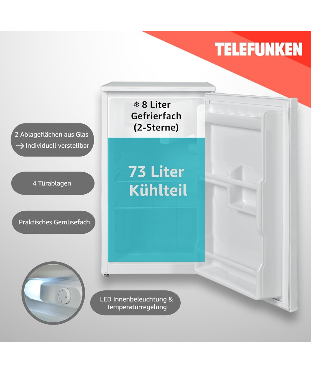 Mit einem großzügigen Nutzinhalt von insgesamt 81 Litern (73 L Kühlen / 8 L Gefrieren) bietet die Kühl-Gefrierkombination von Telefunken ausreichend Platz für einen einen Single- oder Zwei-Personen-Haushalt. Der Telefunken Kühlschrank verfügt zudem über eine praktische Abtauautomatik im Kühlraum. - Perfekte Organisation
