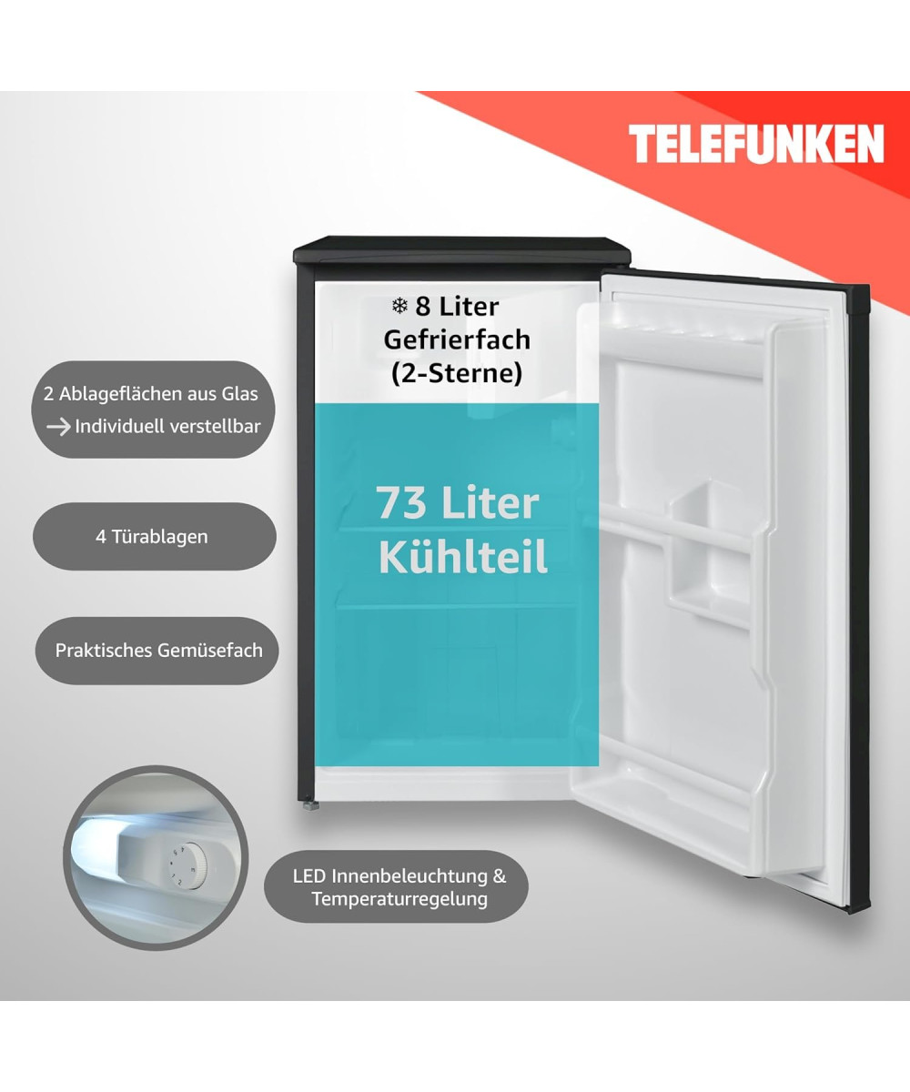 Mit einem großzügigen Nutzinhalt von insgesamt 81 Litern (73 L Kühlen / 8 L Gefrieren) bietet die Kühl-Gefrierkombination von Telefunken ausreichend Platz für einen einen Single- oder Zwei-Personen-Haushalt. Der Telefunken Kühlschrank verfügt zudem über eine praktische Abtauautomatik im Kühlraum. - Perfekte Organisation