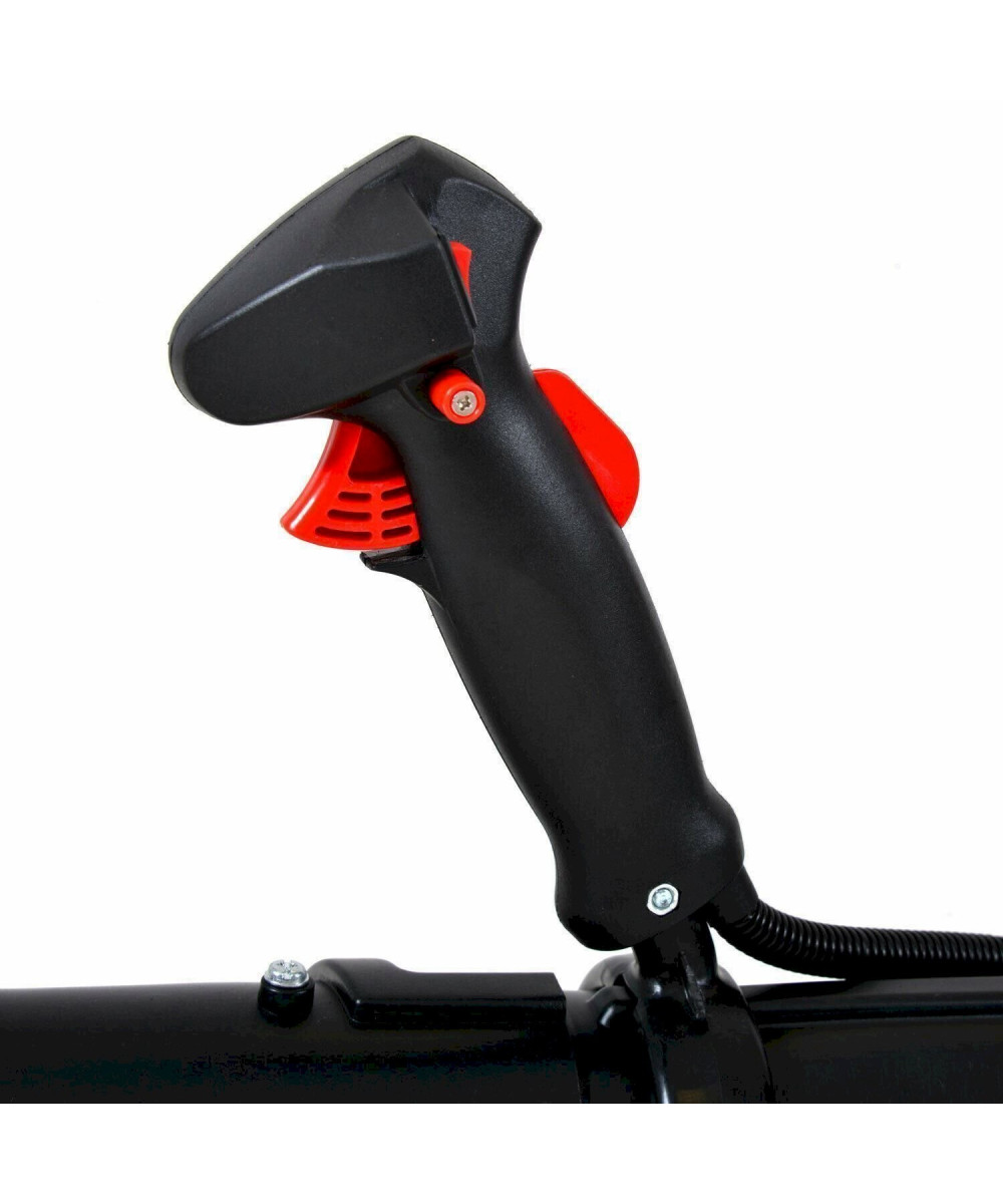 Der Benzinmotor, der mit Kraftstoff im Mischverhältnis 1:40 betrieben wird, lässt sich über einen Seilzugstarter an der Seite leicht in Betrieb nehmen. Der Tank, der auf der Oberseite des Laubbläsers angebracht ist, besitzt ein Fassungsvermögen von 2,5 l.