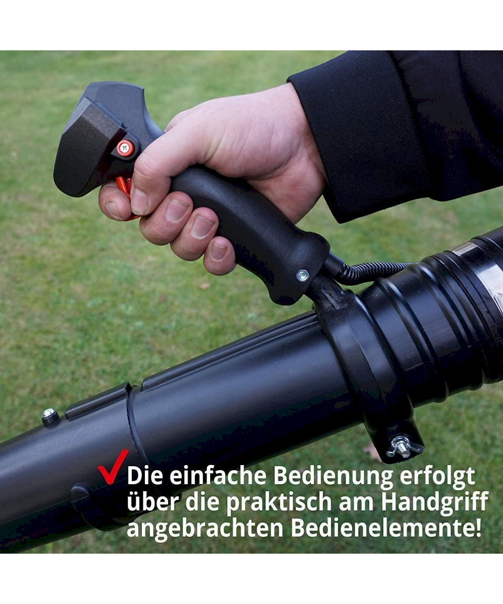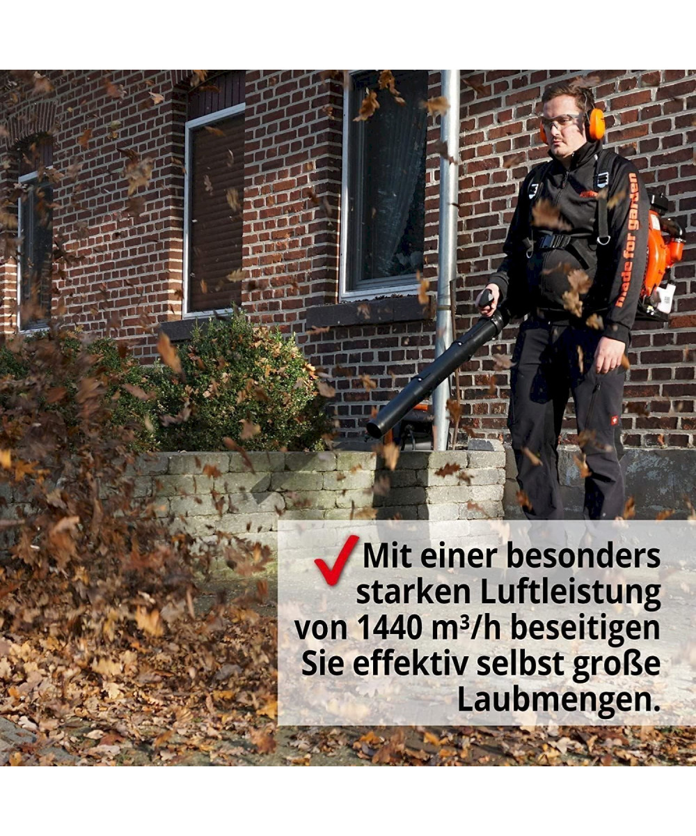 Bester Tragekomfort und ein geringes Gewicht von nur 11 kg (ohne Tankinhalt) zeichnen den Laubbläser aus. Der Einzylinder Motor bringt eine Geräteleistung von 4,6 PS bei einem Hubraum von 79,4 cm mit. Pro Stunde bringt das Gerät eine maximale Luftleistung von 1440 m. Das Gerät sitzt mit einem komfortablen Tragegurt bequem auf dem Rücken und lässt sich über den Handgriff vollständig bedienen. Dort sind alle Bedienelemente ergonomisch integriert.