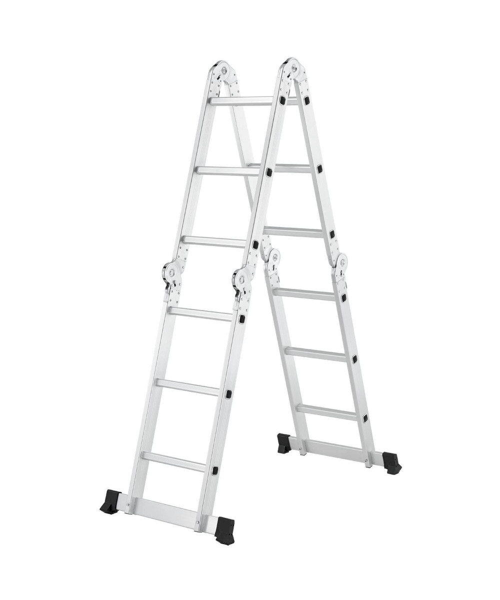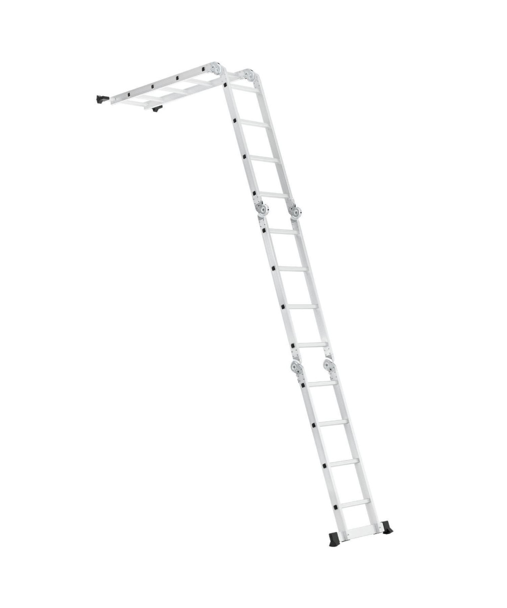 Unsere Vielzweckleiter ist ein echtes Multitalent. Das ausgeklügelte Gelenksystem mit 6 Gelenken teilt die Mehrzweckleiter in 4 Elemente mit jeweils 3 Sprossen. So können Sie die Leiter je nach Bedarf als Anlegeleiter oder Bockleiter verwenden. Voll ausgeklappt erreicht die Leiter eine Höhe von 3,6 Meter.