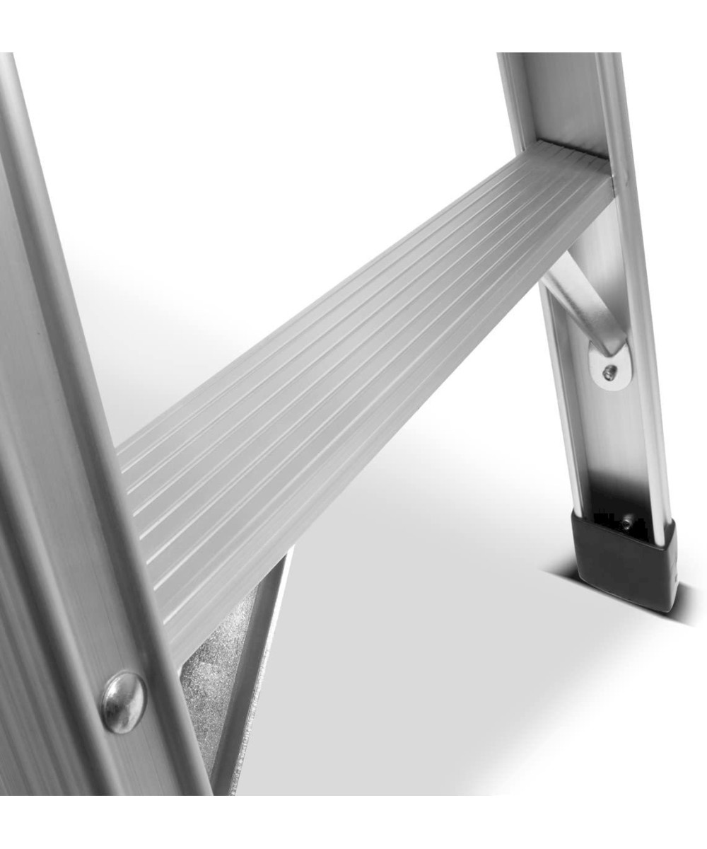 - Der verwindungssteife Aluminium-Rahmen des Montagetritts bietet maximale Stabilität und die rutschfesten Standfüße sorgen für einen festen Halt.