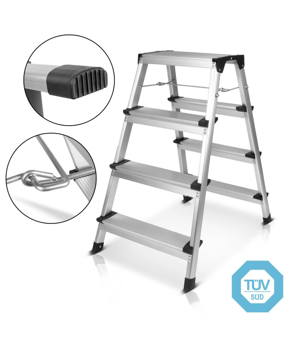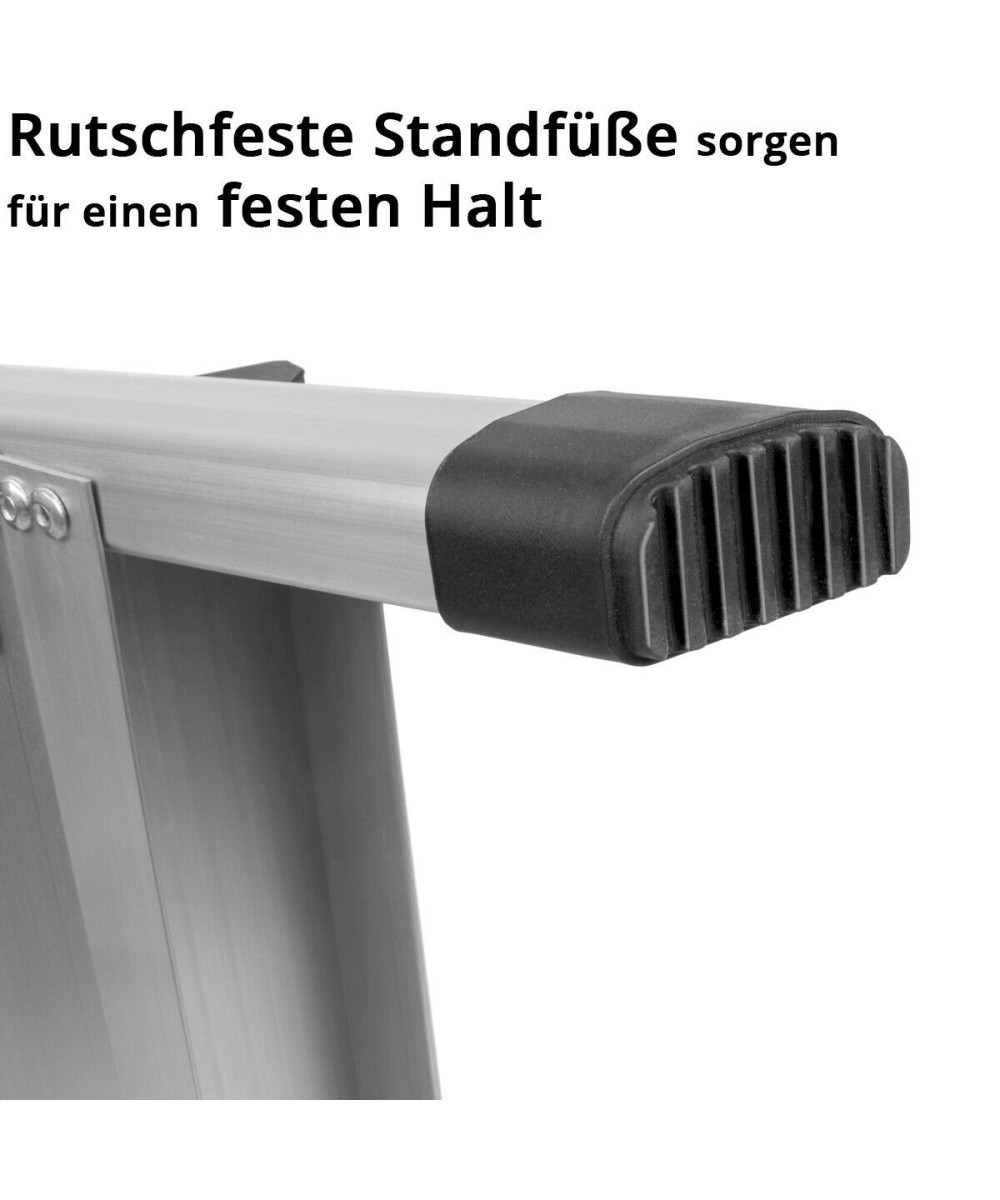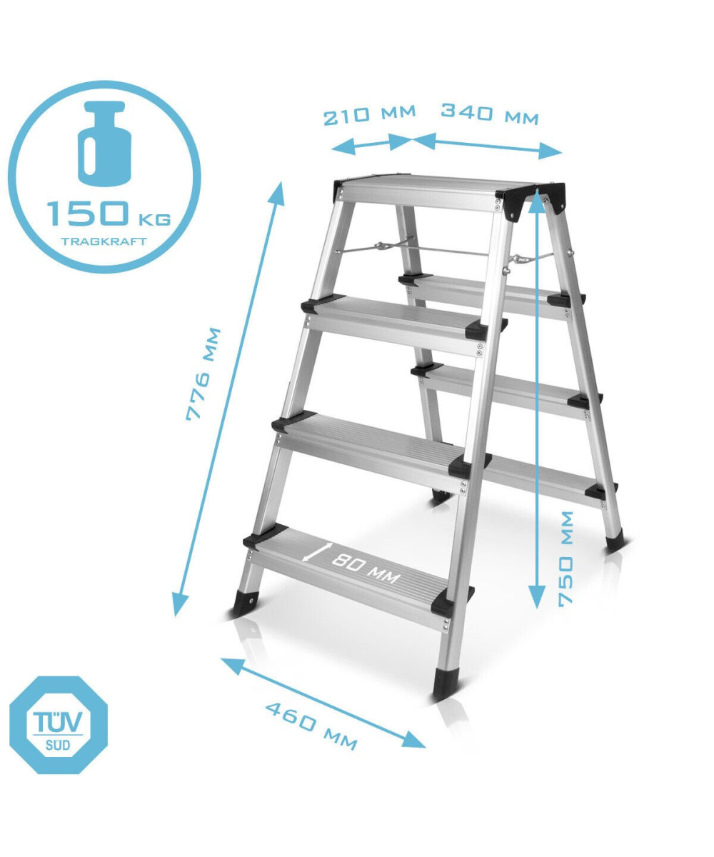 - Die praktische Klappleiter lässt sich mit jeweils 4 Stufen beidseitig nutzen.