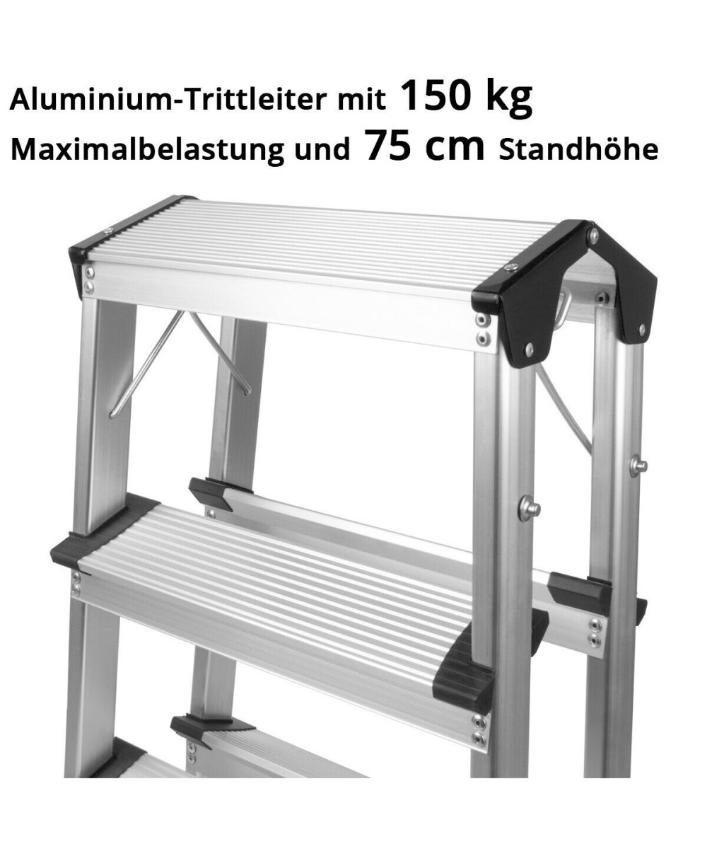 - Hochwertige Aluminium-Trittleiter mit einer maximalen Belastbarkeit von 150 kg und einer Standhöhe von 75 cm.