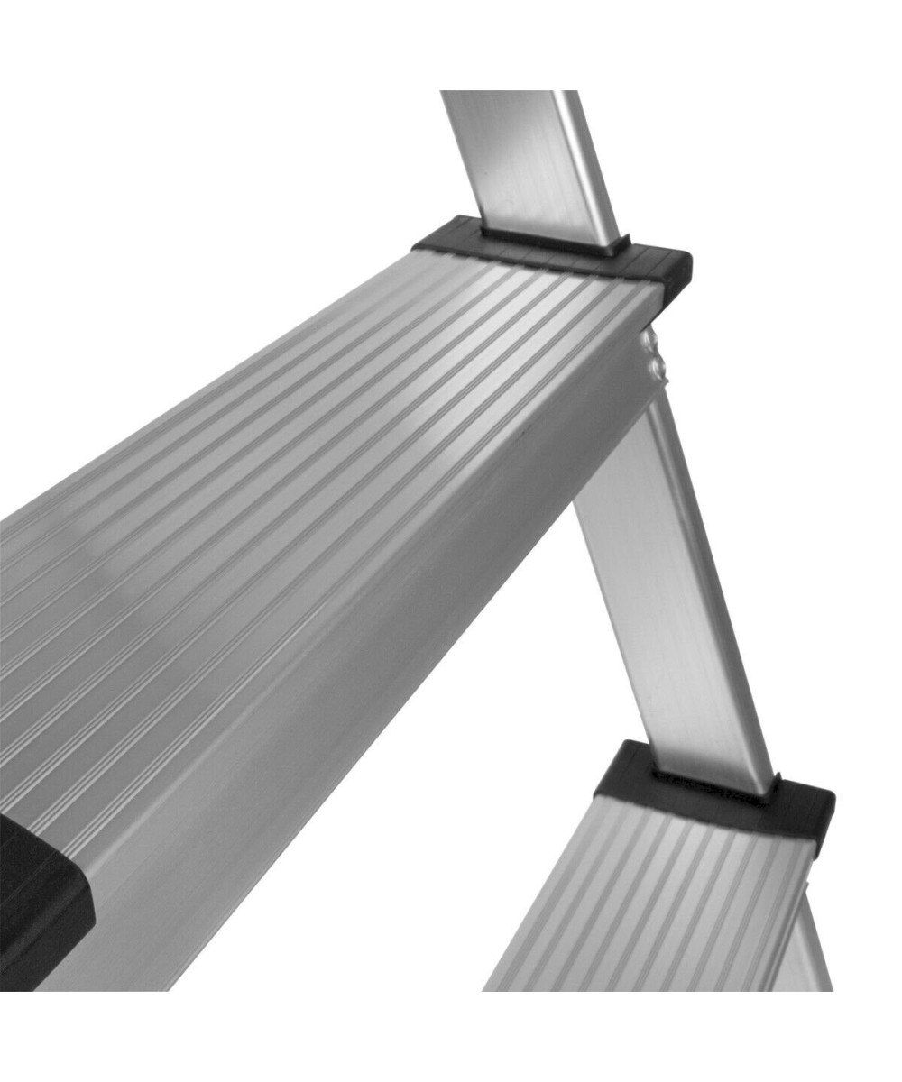 Hochwertige Aluminium-Trittleiter mit einer maximalen Belastbarkeit von 150 kg und einer Standhöhe von 75 cm. Die praktische Klappleiter lässt sich mit jeweils 4 Stufen beidseitig nutzen und bietet vielseitige Anwendungsmöglichkeiten. Die breiten Stufen sind rutschsicher und gewährleisten einen sicheren Stand. Der verwindungssteife Rahmen des Klapptritts bietet maximale Stabilität und die rutschfesten Standfüße sorgen für einen festen Halt. Zur platzsparenden Aufbewahrung lässt sich die Mehrzweckleiter zusammenklappen. Das geringe Gewicht von nur 3,8 kg ermöglicht einen einfachen Transport. Die vielseitige Leiter eignet sich ideal zur Anwendung bei Bau- und Renovierungsarbeiten, in Werkstatt, Haushalt und DIY.