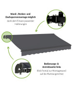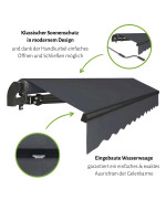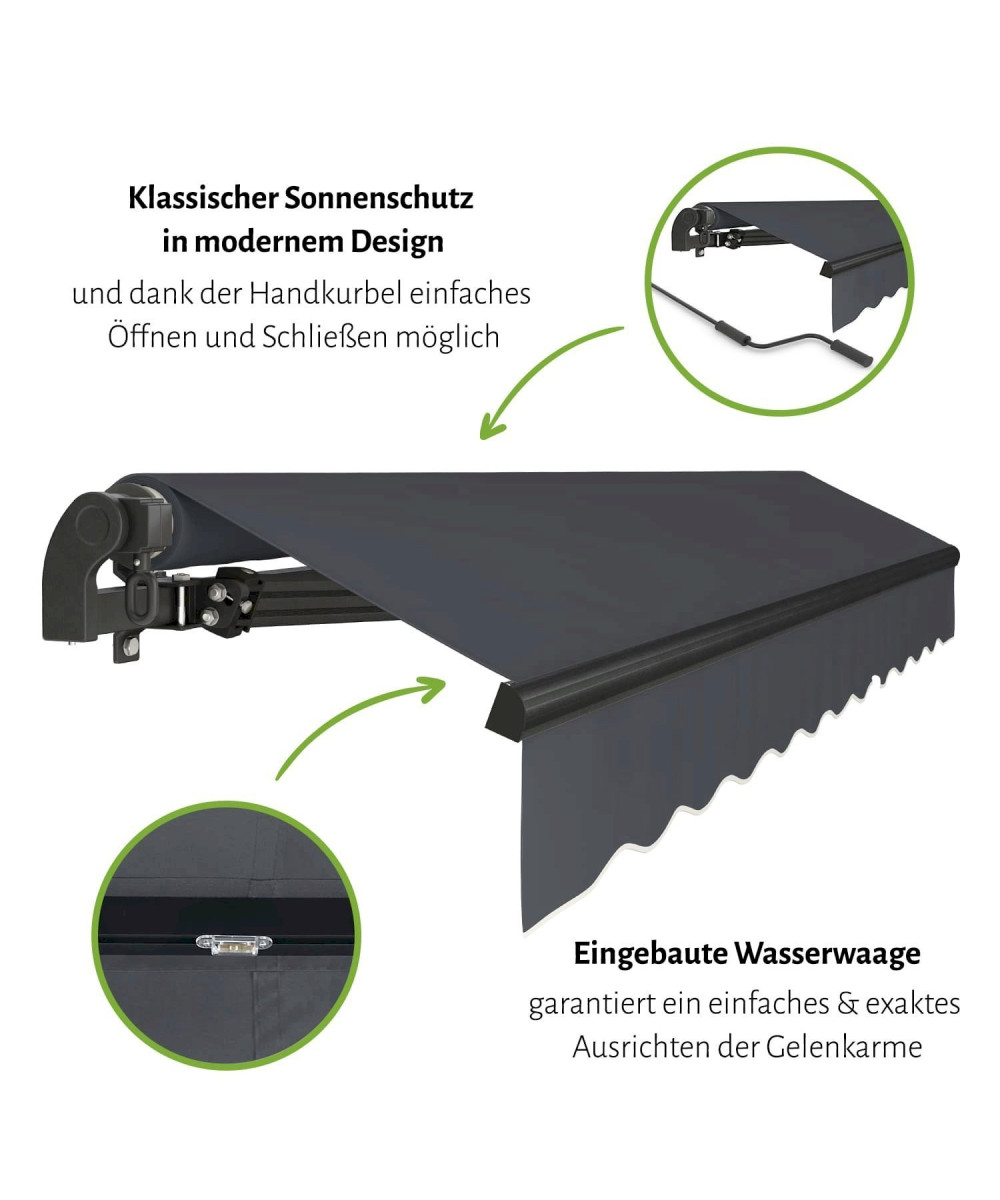 Die Gelenkarmmarkise überzeugt durch die einfache Bedienung per Handkurbel an der linken Seite und bietet zuverlässigen Schutz vor Sonne und schlechten Wetterbedingungen. Der Neigungswinkel kann problemlos verstellt werden, sodass du jederzeit im Schatten sitzen kannst. Dank der eingebauten Wasserwaage im Ausfallprofil ist das genaue Einstellen der Arme kinderleicht. Das pulverbeschichtete Alu-Gestell und der wetterfeste Polyesterstoff ermöglichen eine lange Lebensdauer deiner Markise.
