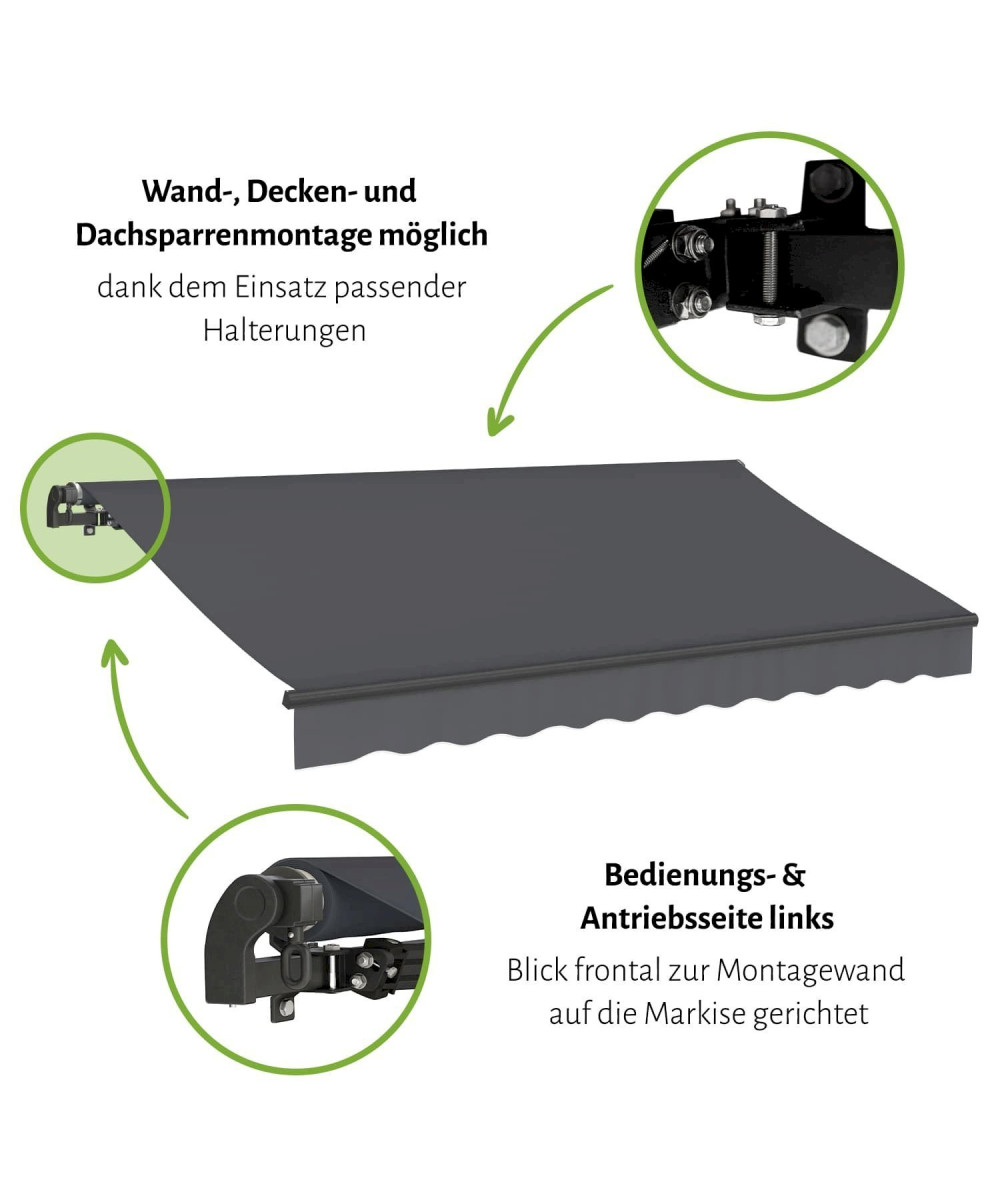 - Seite Getriebe / Kurbel: links (Blick auf Markise)