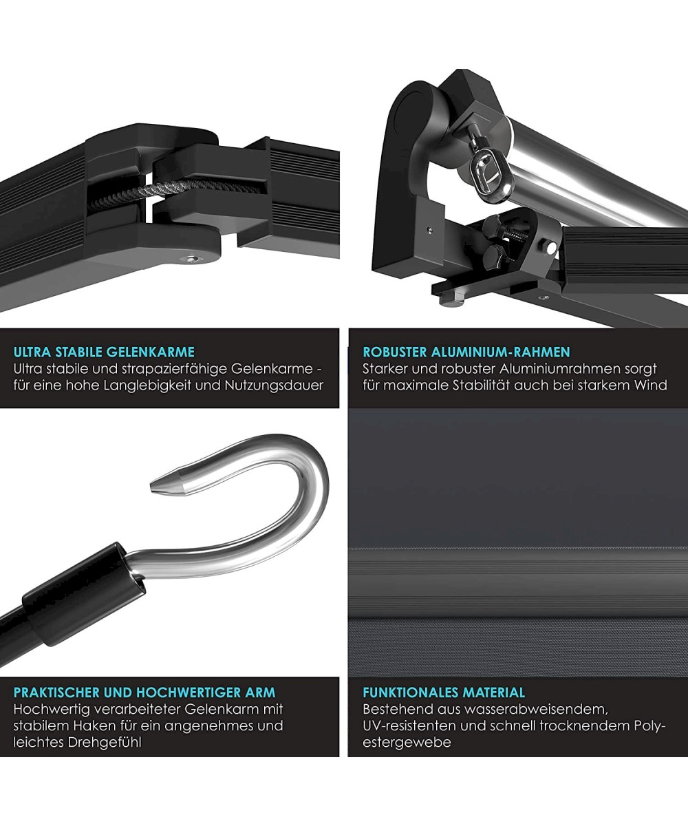 Ultra stabile und strapazierfähige Gelenkarme garantieren Ihnen eine hohe Langlebigkeit und Nutzungsdauer. Zudem sorgt ein starker und robuster Aluminiumrahmen für maximale Stabilität und das sogar bei starkem Wind. Durch die Verarbeitung von hochwertigem Aluminium ist die Bildung von Rost ausgeschlossen, dadurch glänzt die Balkonmarkise auch noch nach mehreren Jahren.
