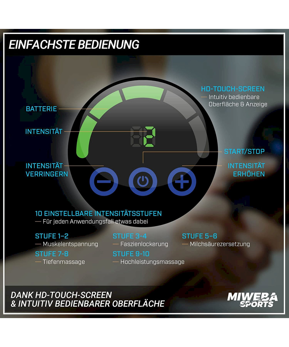 Wählen Sie aus zehn verschiedenen Intensitätsstufen der Massage-Gun: Je nach persönlichen Vorzügen und Verspannungsgrad. So ist es etwa möglich, nach einer anfänglich leichten Lockerung der oberen Muskelstränge, eine intensive Tiefenmassage mit der Faszienpistole durchzuführen. Mit ihren speziellen Aufsätzen für bestimmte Anwendungsbereiche und den fein abgestimmten Vibrationsstufen trifft die Miweba Sports Massagepistole MM100 als ganzheitliches Muskelmassagegerät ins Schwarze.