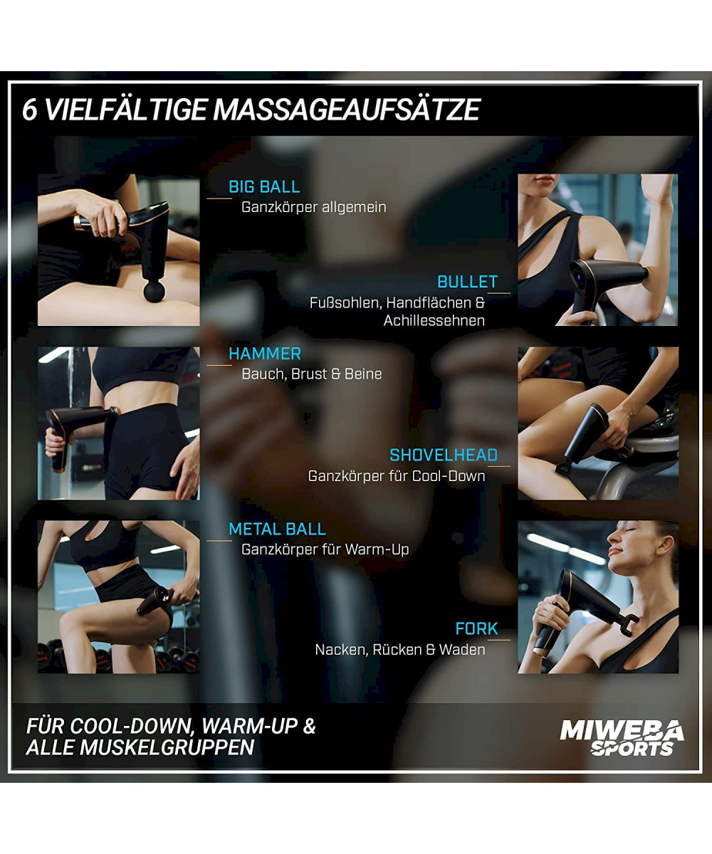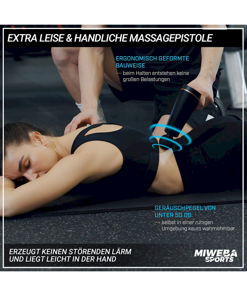 Mit der Miweba Sports Massagepistole MM100 lassen sich Muskeln und Körperpartien gezielt massieren und entspannen. Zehn Intensitätsstufen und sechs Aufsätze sorgen für vielfältige Einsatzzwecke und helfen bei der schnellen Regeneration . Von der Lockerung der Faszien bis hin zur effektiven Tiefenmassage: Ein hoher Funktionsumfang ist stets gegeben. Die Massage-Gun ist ergonomisch geformt und liegt entsprechend gut in der Hand. Dank intuitiver Bedienung und HD-Touch-Screen können Einstellungen jederzeit individuell angepasst werden. Durch eine Akkuleistung von bis zu fünf Stunden und einem besonders geräuscharmen Betrieb eignet sich die Miweba Sports Massagepistole MM100 ideal für Anwendungen in ruhiger Atmosphäre: Egal ob vor oder nach dem Sport und wann immer eine wohltuende Massage gewünscht wird.