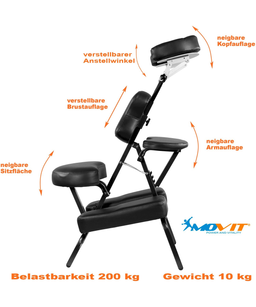 Entspannung und Wellness pur! Die MOVIT® Massagestühle ermöglichen Behandlungen, die auf einem Massagetisch gar nicht denkbar sind, beispielsweise chiropraktische und osteopathische Anwendungen. Der hochwertige MOVIT®-Massagestuhl ist vielseitig einsetzbar, begonnen bei mobiler Massage, Einsatz in der Physio- und Ergotherapie, Rehabilitation, Akkupunktur bis hin zu Tätowierungen. Sitz und Armablage sind verstellbar, auch die Kopfstütze ist in ihrer Höhe und im Anstellwinkel justierbar. Der professionelle Massagestuhl ist platzsparend zusammenklappbar. Durch sein geringes Gewicht und die im Lieferumfang enthaltene Tragetasche kann er problemlos transportiert werden.