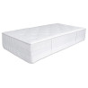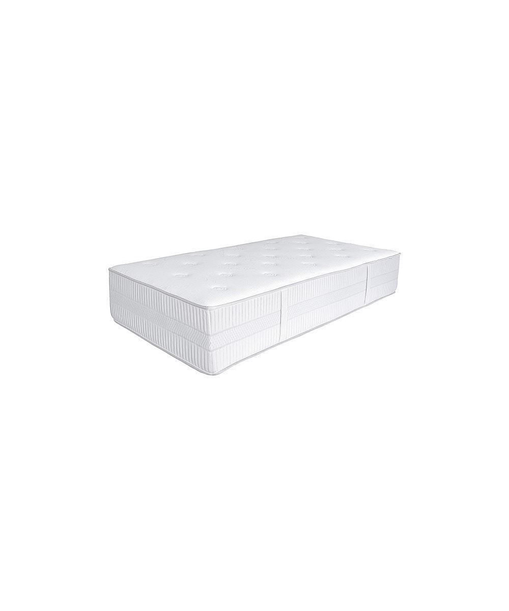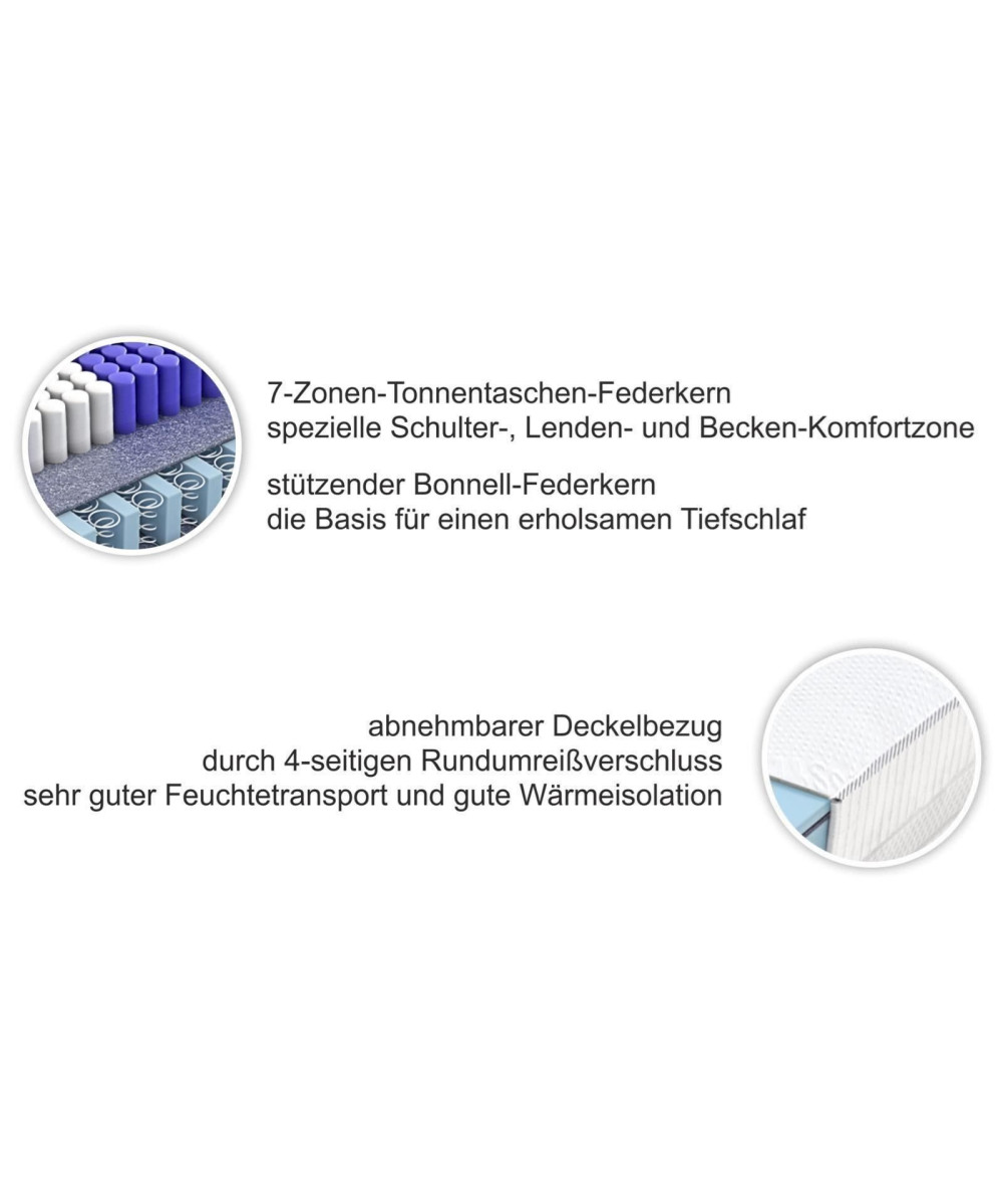 | Diese Doppelfederkernmatratze mit Boxspring-Feeling in einer 7-Zonen -Ausführung gewährleistet ein perfektes Schlafklima , hohe Punktelastizität und dadurch einen körpergerechten Liegekomfort . Die Matratze besteht aus einer Ober-, Untermatratze und einen integrierten Topper , in einem System. Die beiden integrierten Federkerne lagern und unterstützen Ihren Körper (auch bei Übergewicht) optimal, da Ihr Gewicht elastisch aufgenommen und zweistufig unterstützt wird. Die einzelnen Tonnentaschenfedern der Obermatratze , sind eng zusammengestellt, so dass Sie jeden Punkt des aufliegenden Körpers individuell unterstützen. Jede einzelne Feder ist in einer Tasche vernäht, die so dünn ist, dass von der Federelastizität nichts verloren geht. Der stützende Taillenfederkern ist die zweite Stufe des Systems. Entscheidend ist in diesem Fall die charakteristische Form der Federn. Deren Form ähnelt einer Sanduhr. Das bedeutet, die Stahlfeder wird jeweils zur Mitte hin etwas schmaler und zu den beiden Enden hin wieder breiter. Durch diese Taillierung sind diese trotz hoher Elastizität sehr stabil und durch die Behandlung des Materials außerdem sehr bruchsicher. Die doppelt vergüteten Federn aus Stahl sind thermisch behandelt und weisen daher eine hohe Flexibilität auf. Der abnehmbare , waschbare Bezug ist mit hochwertiger, feuchtigkeitsregulierender und atmungsaktiver Klimafaser versteppt. Mit der Klimafaser erhält man stets ein angenehmes Schlafklima. Außerdem reguliert die Klimafaser die Feuchtigkeit, so dass man auch beim Schwitzen im Schlaf ein trockenes Schlafklima erhält. Boxspringmatratzen sind zweifelsohne für jeden geeignet, der viel Wert auf guten und erholsamen Schlaf legt. Durch die hohe Stützkraft und die sehr gute körperliche Anpassung vom Tonnentaschenfederkern und Taillenfederkern profitieren Personen mit Erkrankungen der Wirbelsäule etc. besonders von diesem Matratzenmodell. Aufgrund des hohen Matratzensystems von 33 cm , wird das Hinlegen und Aufstehen erleichtert. Durch die integrierte Unterfederung, ist die Matratze auch für Pallettenbetten oder andere, niedrigere Betten mit und ohne Unterfederung geeignet. | |