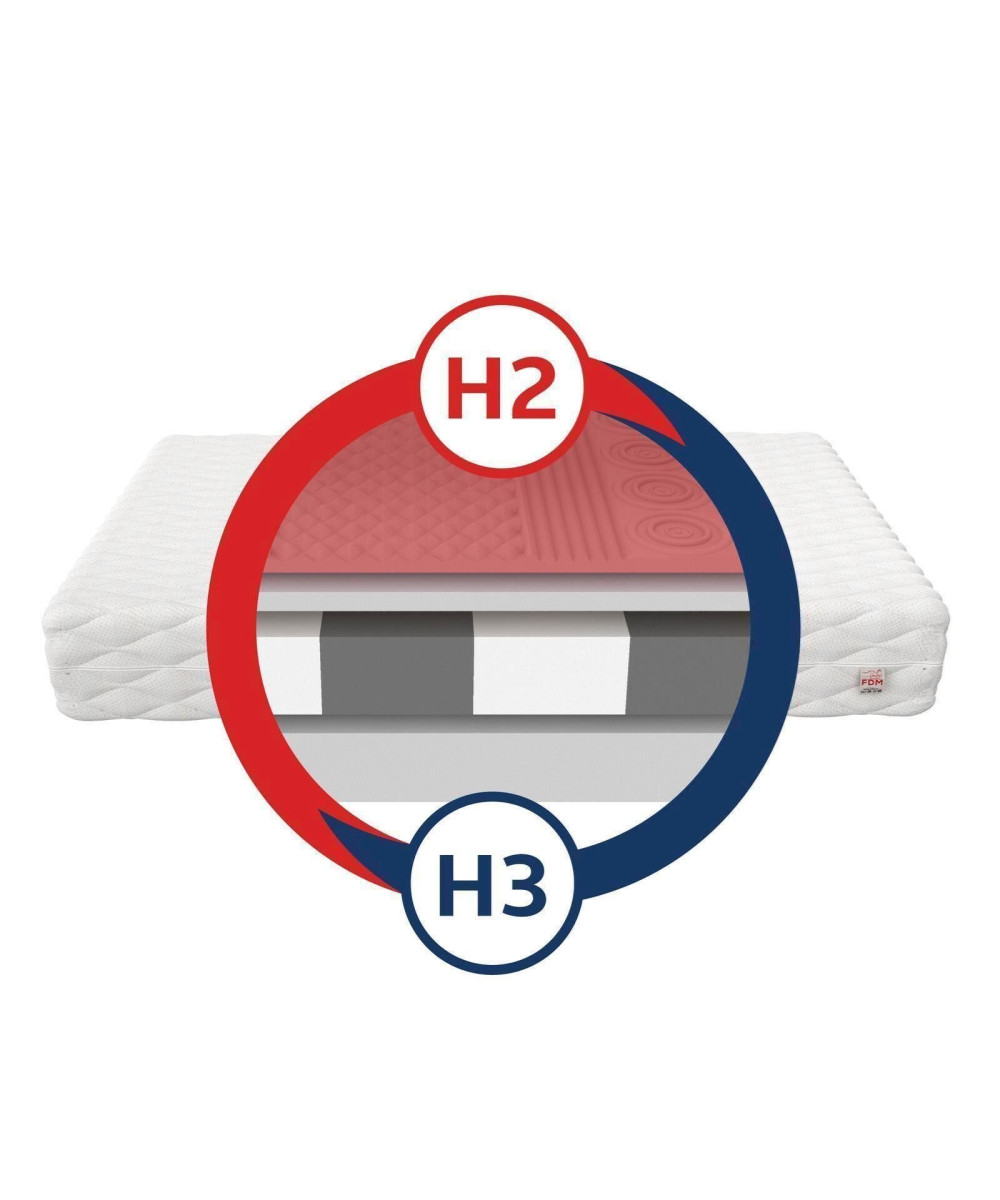 Aufgrund des unterschiedlichen Aufbaus besitzt die Matratze zwei Härtegrade. Wie auf der Abbildung zu sehen, hat die obere Liegefläche Härtegrad 2, die untere Liegefläche Härtegrad 3