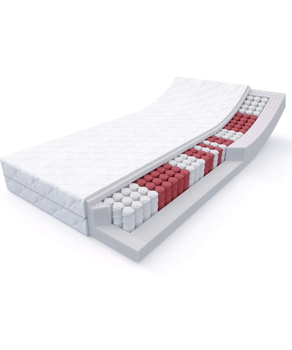 Unsere 7 Zonen Taschenfederkern Matratze Medic besteht aus einem hochwertigen Taschenfederkern mit jeweils 3 cm Kaltschaum Auflagen und Seitenstegen. Der Kaltschaum lässt Sie einsinken und die Federkerne stützen Ihren Körper je nach Zone unterschiedlich stark. Der Federkern sorgt für eine perfekte Durchlüftung und den Feuchtigkeitsabtransport aus der Matratze.