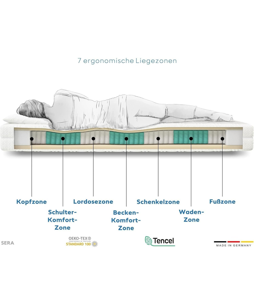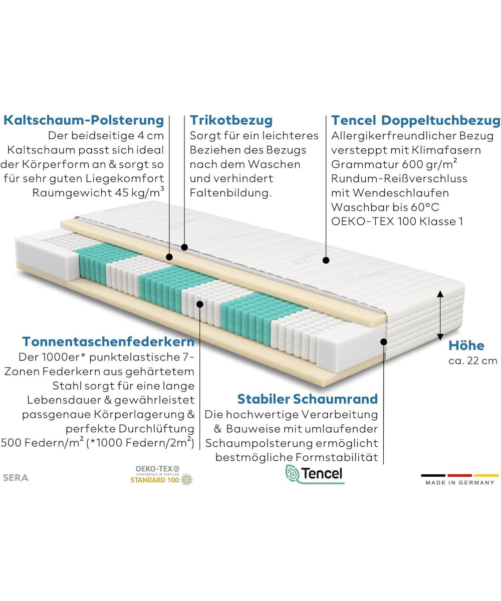 Die Matratze SERA im Härtegrad 3 ist eine mittel bis mittelfeste in 7-Zonen-Komfort unterteilte Matratze mit einem Tonnentaschenfederkern (TTFK) und einer 4cm hohen, anschmiegsamen und beidseitig verwendbaren Kaltschaumauflage. Sera ist keine sehr feste, aber auch keine sehr weiche Matratze. Aufgrund ihres 22cm großen und ihres mehrschichtigen Aufbaus in verschiedenen Drahtstärken stützt die TTFK-Matratze Ihren Körper punktgenau und elastisch ab, egal ob Sie bevorzugt in der Rücken-, Bauch- oder Seitenlage schlafen. Gleichzeitig bietet die Matratze eine luftdurchlässige Struktur, die den Feuchtigkeitstransport beschleunigt und den Wärmestau im Bett verhindert. Wegen ihrer festen stützenden Liegeeigenschaften und ihrer hohen Punktelastizität ist die Matratze SERA (H3) 270x200 für Gewichtsklassen Körpergewicht bis 100 kg ideal.
