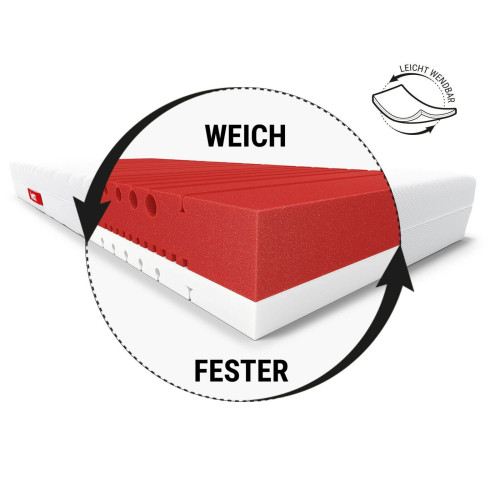Mit der BODYGUARD® Weich haben Sie die Wahl: Möchten Sie wirklich weich (H1) oder doch lieber etwas fester (H2) liegen? Ober- und Unterseite bieten Ihnen verschiedene Liegehärten nach DIN EN 1957, zwischen denen Sie sich gemäß Ihrer Vorlieben entscheiden können. Einfach wenden! Wie auch immer Ihre Wahl ausfällt – die BODYGUARD® Weich sorgt für angenehmen Schlafkomfort.