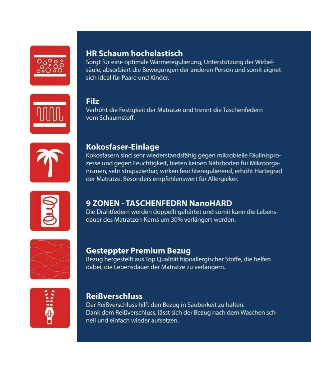 wird in der NanoHARD-Technologie hergestellt. Die Drahtfedern werden doppellt gehärtet und somit kann die Lebensdauer des Matratzen-Kerns um 30% verlängert werden.